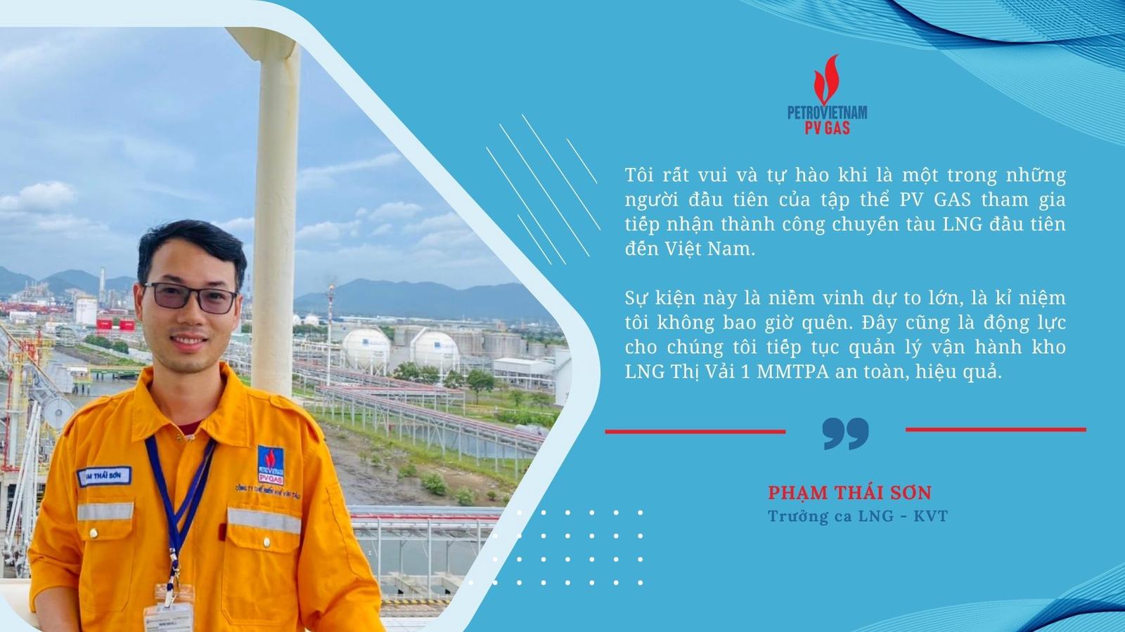 Anh Sơn chia sẻ: “Tôi đã rất trăn trở lo lắng về quá trình tiếp nhận tàu LNG cập và rời cảng, vì đây là quá trình phức tạp và chứa nhiều rủi ro liên quan tới an ninh, an toàn hàng hải cũng như cần sự phối hợp nhịp nhàng nhuần nhuyễn của các bên liên quan. Thế nhưng, dưới sự chỉ đạo sát sao của lãnh đạo PV GAS/ KVT và sự nỗ lực của tất cả mọi người, chúng tôi đã thực hiện tiếp nhận tàu và Gas-in thành công”.