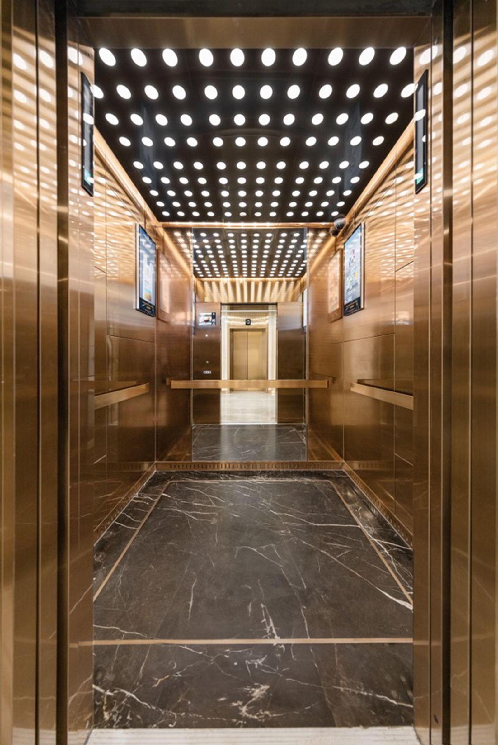 Thang máy mới được cải tạo, mang màu vàng đồng sang trọng