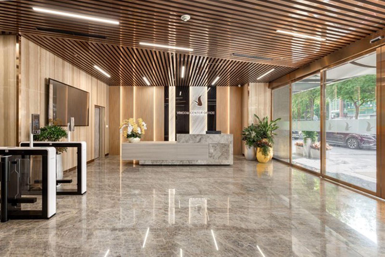 Khu vực sảnh lễ tân của khối văn phòng được chăm chút từng chi tiết