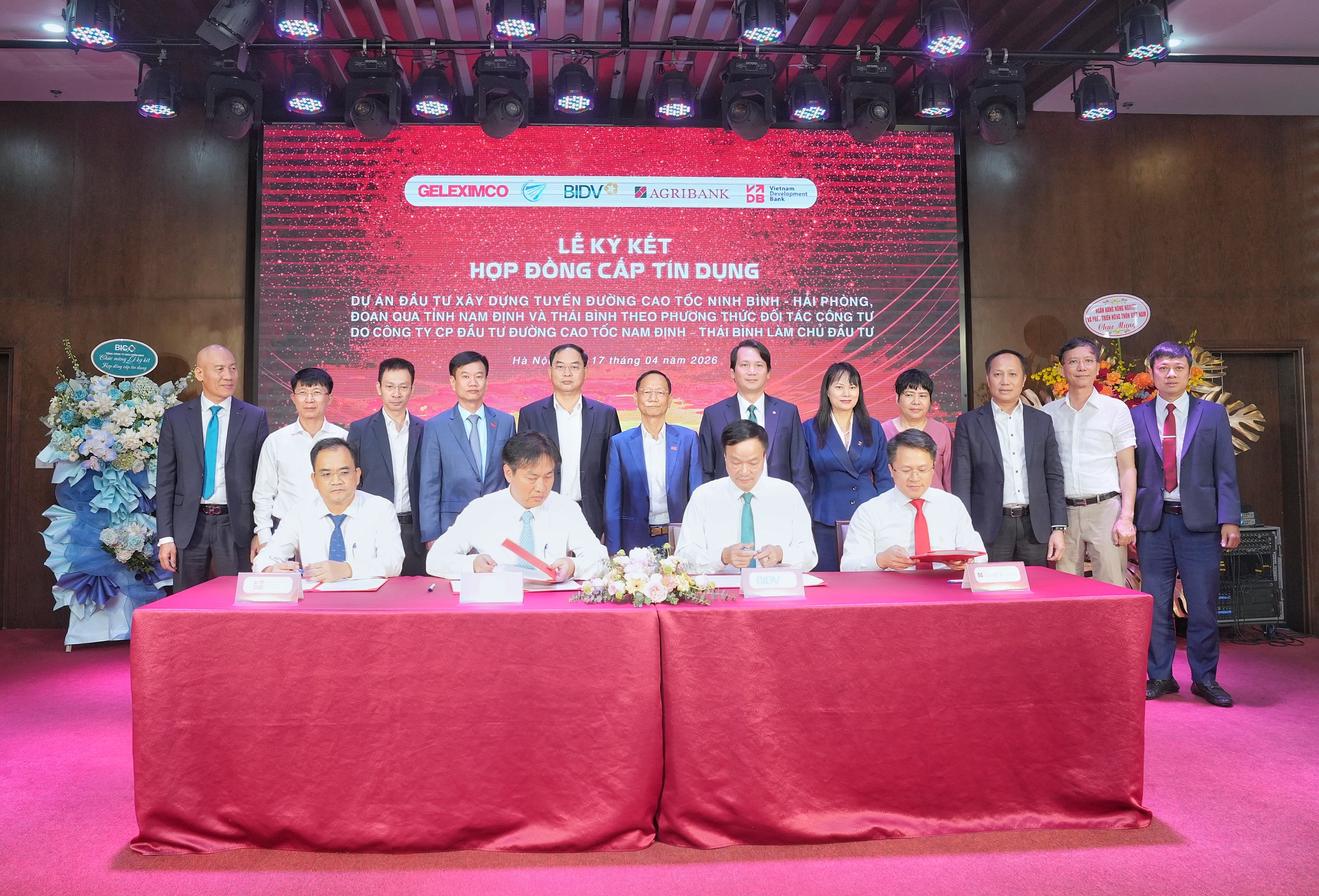 (Thanh tra) - Sáng ngày 17/4/2026 tại Hà Nội, Ngân hàng Phát triển Việt Nam (VDB) Chi nhánh Thái Bình phối hợp Ngân hàng TMCP Đầu tư và Phát triển Việt Nam (BIDV) và Ngân hàng Nông nghiệp và Phát triển Nông thôn Việt Nam (Agribank) tổ chức Lễ ký kết Hợp đồng cấp tín dụng Dự án đầu tư xây dựng tuyến đường cao tốc Ninh Bình - Hải Phòng, đoạn qua tỉnh Nam Định và Thái Bình, theo phương thức đối tác công tư do Công ty Cổ phần Đầu tư Đường cao tốc Nam Định - Thái Bình làm chủ đầu tư.