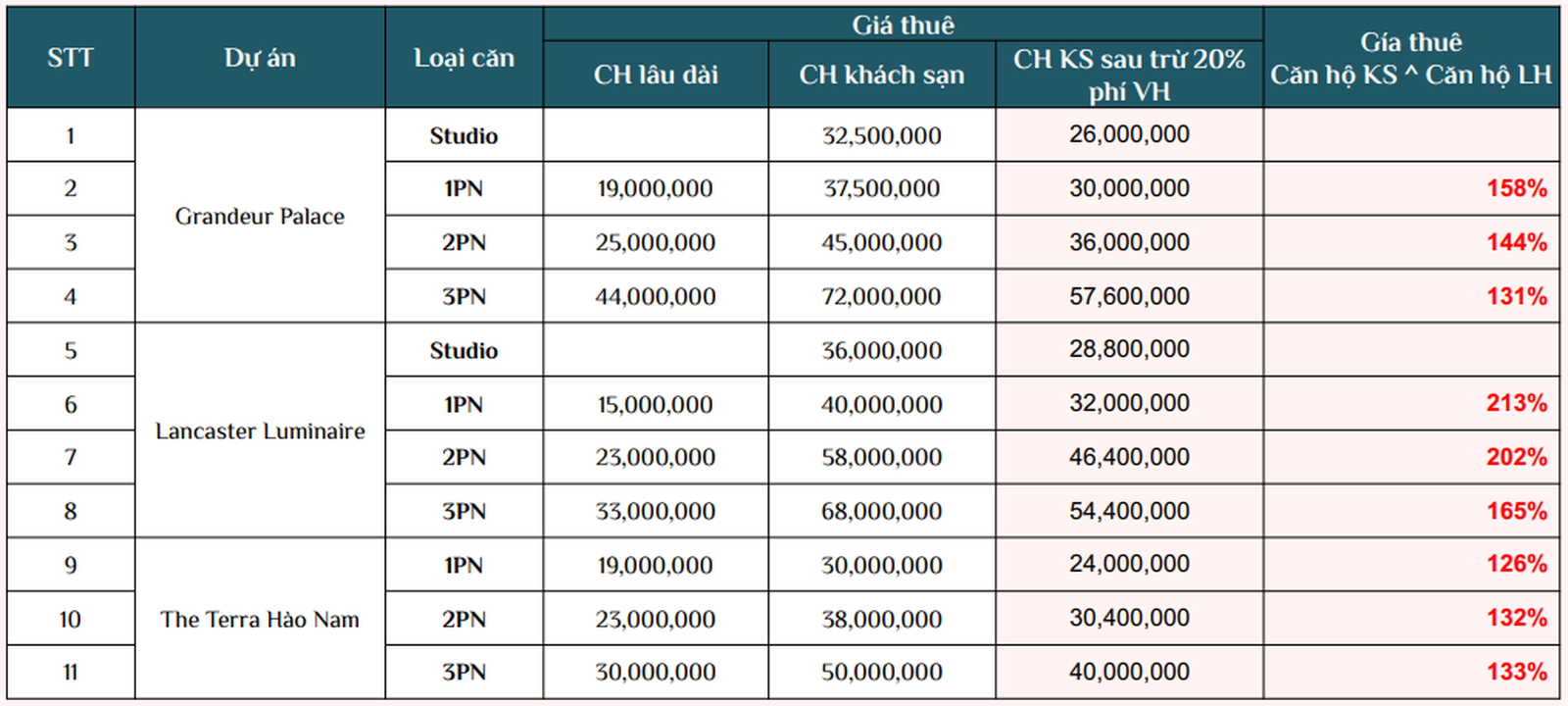 Đơn cử căn hộ 45m2 tại Dự án Grandeur Place cho thuê 32 triệu đồng/tháng; căn tương tự tại Dự án Lancaster Luminaire cho thuê 36 triệu đồng/tháng.