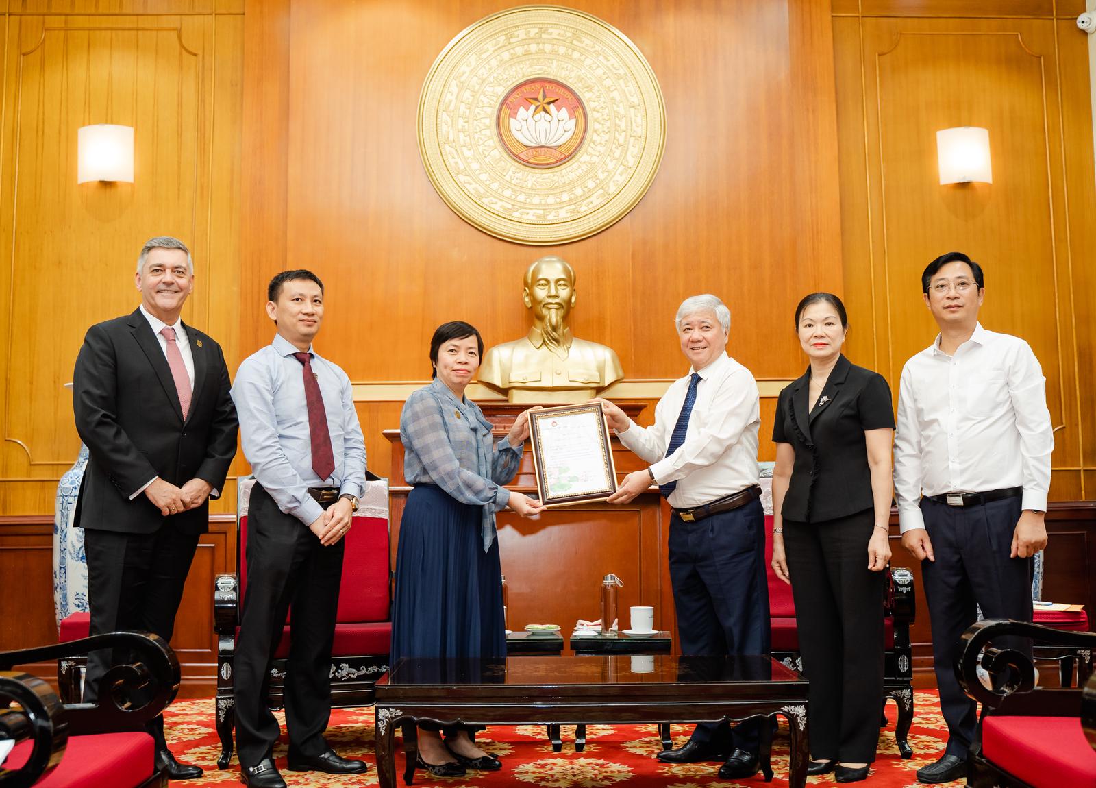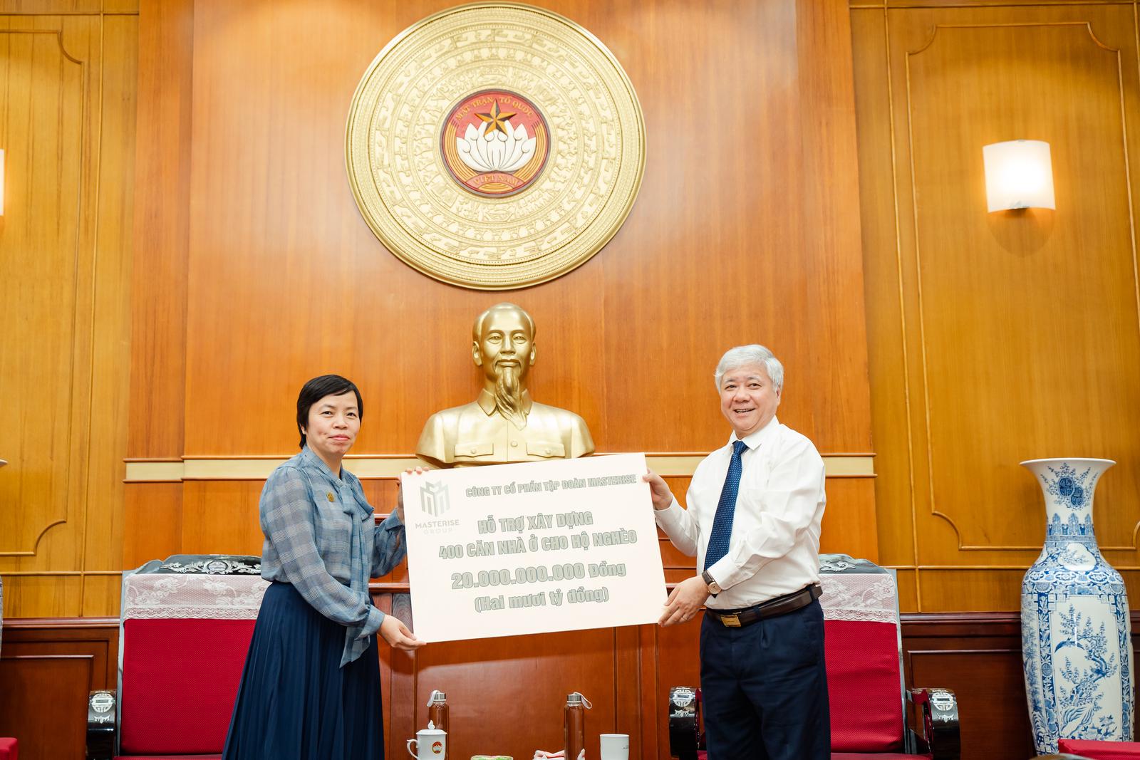Chủ tịch Đỗ Văn Chiến và đại diện UBTƯ MTTQ Việt Nam trao thư cảm ơn đến Masterise Group