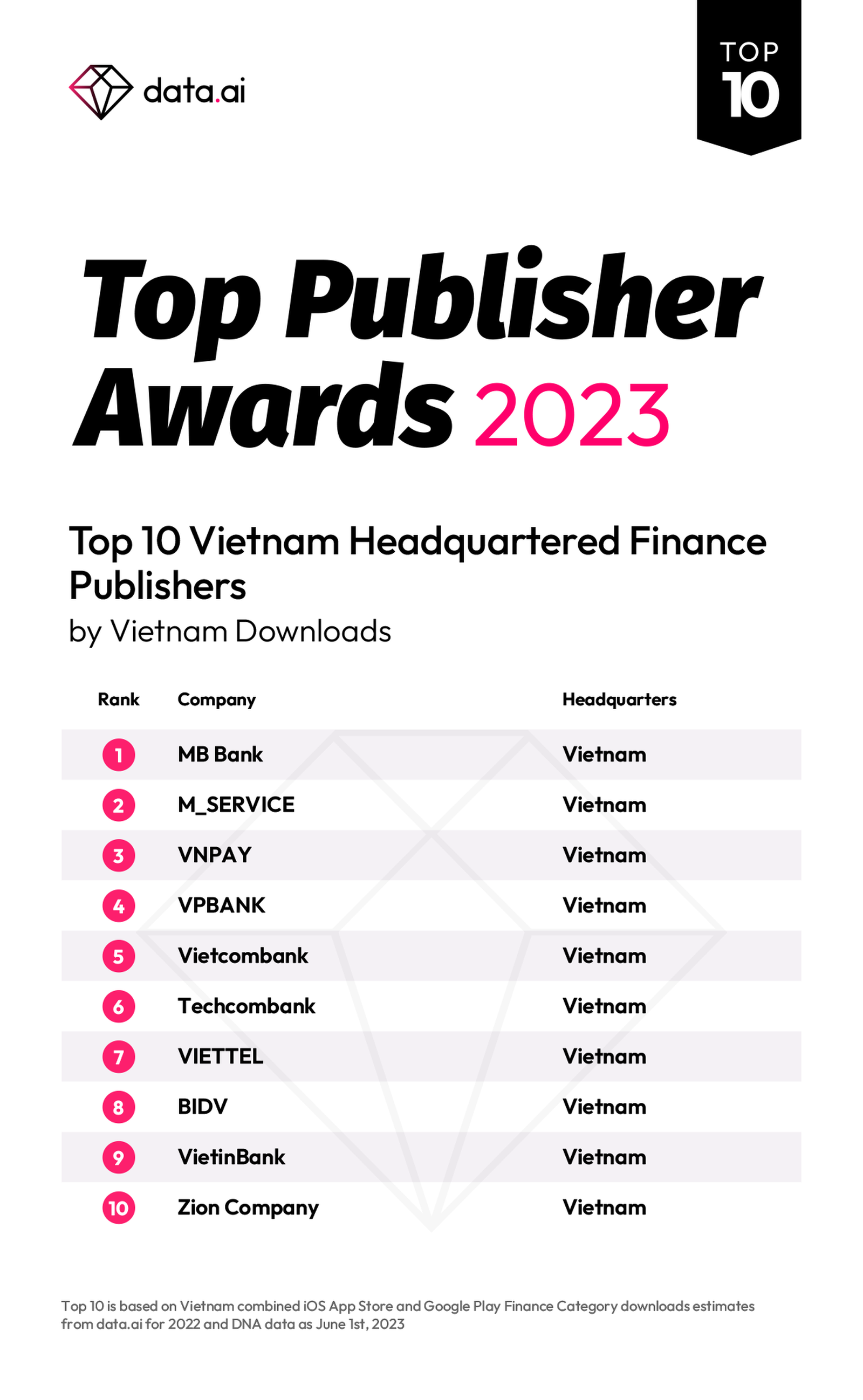 Bảng xếp hạng top 10 nhà phát hành ứng dụng tài chính tại Việt Nam năm 2023 theo data.ai