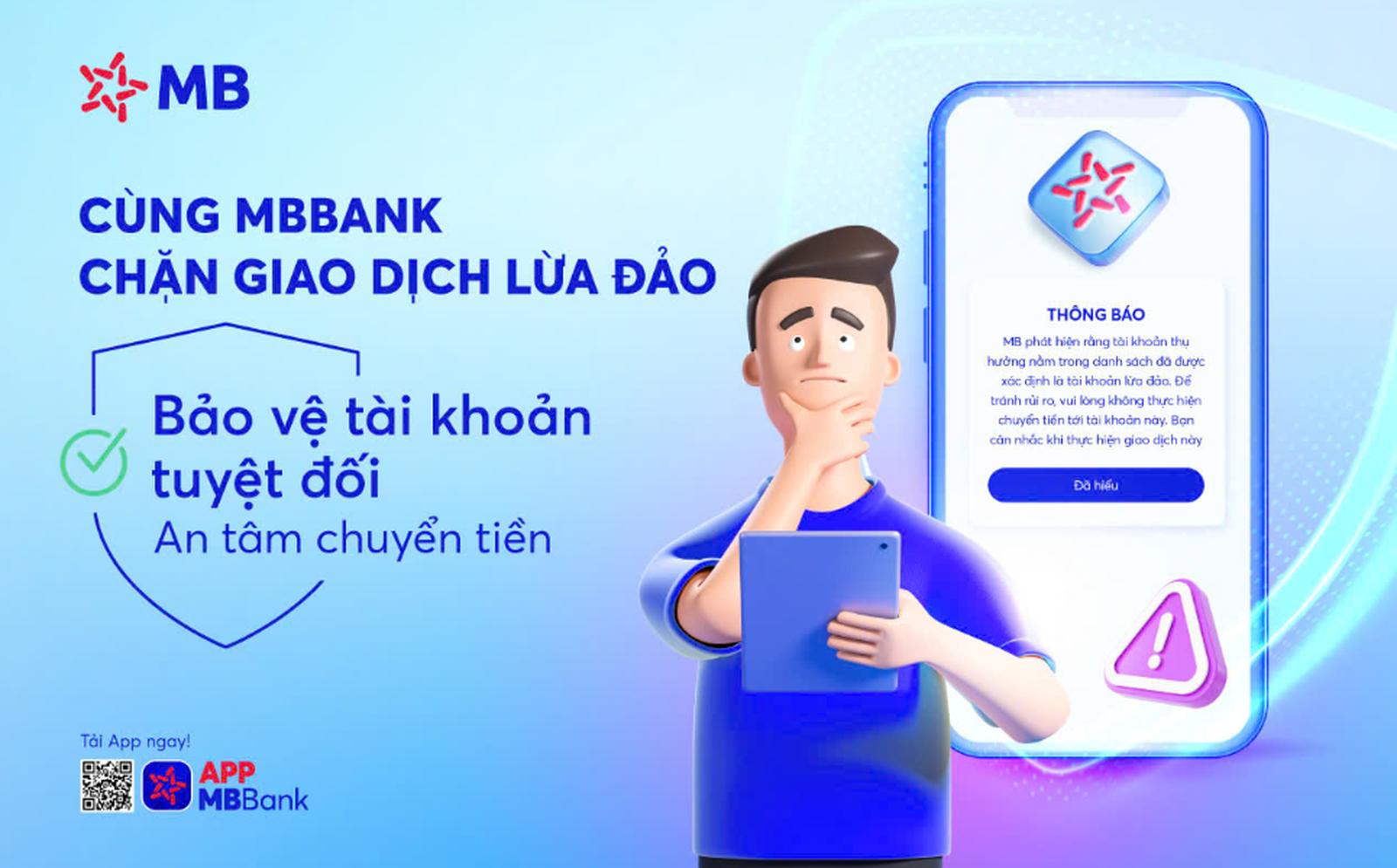Bên cạnh đó, MB đã hợp tác chặt chẽ với Cục An ninh mạng và phòng chống tội phạm sử dụng công nghệ cao (A05) để liên tục cập nhật thông tin về các tài khoản lừa đảo, giúp hệ thống nhận diện và cảnh báo ngay cho khách hàng nếu khách hàng chuẩn bị chuyển tiền đến một tài khoản nằm trong danh sách nghi ngờ. Điều này không chỉ bảo vệ khách hàng mà còn góp phần ngăn chặn hoạt động của các đối tượng lừa đảo.