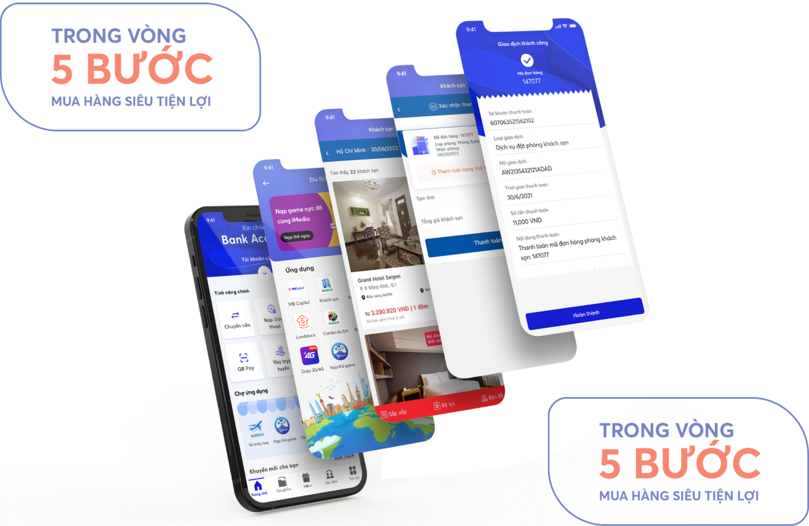 Thấu hiểu về hành vi người dùng thông qua phân tích dữ liêu, chuyên gia công nghệ của MB giúp người dùng tiếp cận đúng dịch vụ, đúng thời điểm và đúng nhu cầu. Chỉ bằng một vài thao tác đơn giản, người dùng App MBBank có thể hoàn tất thao tác mua sắm online, di chuyển, đặt vé máy bay, đặt khách sạn, ship hàng, mua voucher giải trí, ẩm thực,… cùng hê thống thanh toán bảo mật hàng đầu tại Việt Nam.