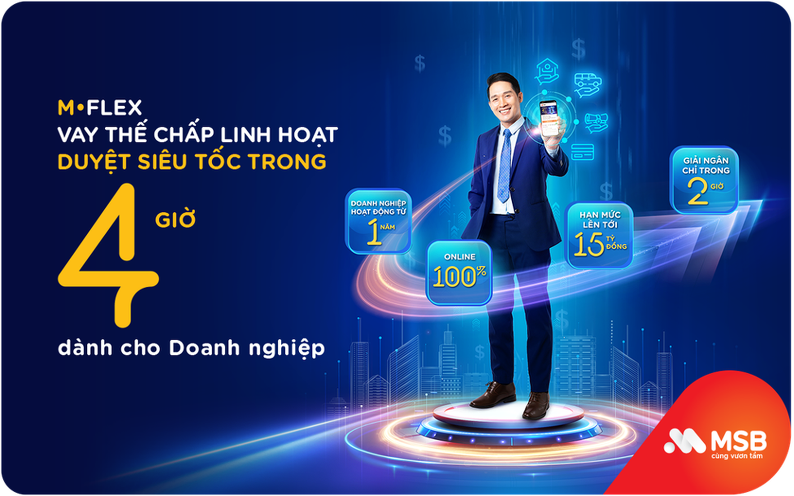 M-Flex: Vay thế chấp trực tuyến lên đến 15 tỷ đồng, phê duyệt chỉ trong 4 giờ làm việc. Toàn bộ quy trình từ đăng ký, xét duyệt đến giải ngân đều thực hiện online, giúp khách hàng tiết kiệm thời gian và nắm bắt cơ hội kinh doanh tức thì.