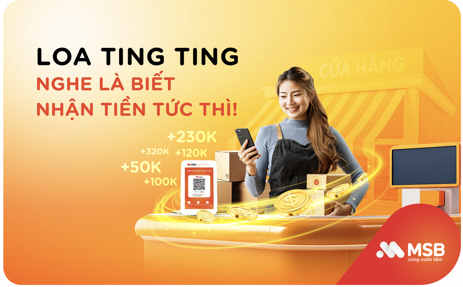 Cùng với ứng dụng MSB Merchant, MSB triển khai thêm Loa Ting Ting – thiết bị thông báo giao dịch bằng giọng nói, giúp nhân viên tại quầy cập nhật ngay khi có chuyển khoản, không bị lệ thuộc vào Wi-Fi hay phải kiểm tra điện thoại. Thiết bị này sở hữu những tính năng có thể cài đặt nhiều tài khoản thanh toán, tùy chỉnh nội dung QR (mã) chuyển khoản. Đặc biệt, MSB đang có chương trình gửi tặng miễn phí dịch vụ khi chủ hộ kinh doanh sở hữu tài khoản thanh toán MSB và đáp ứng điều kiện số dư bình quân tối thiểu hàng tháng.