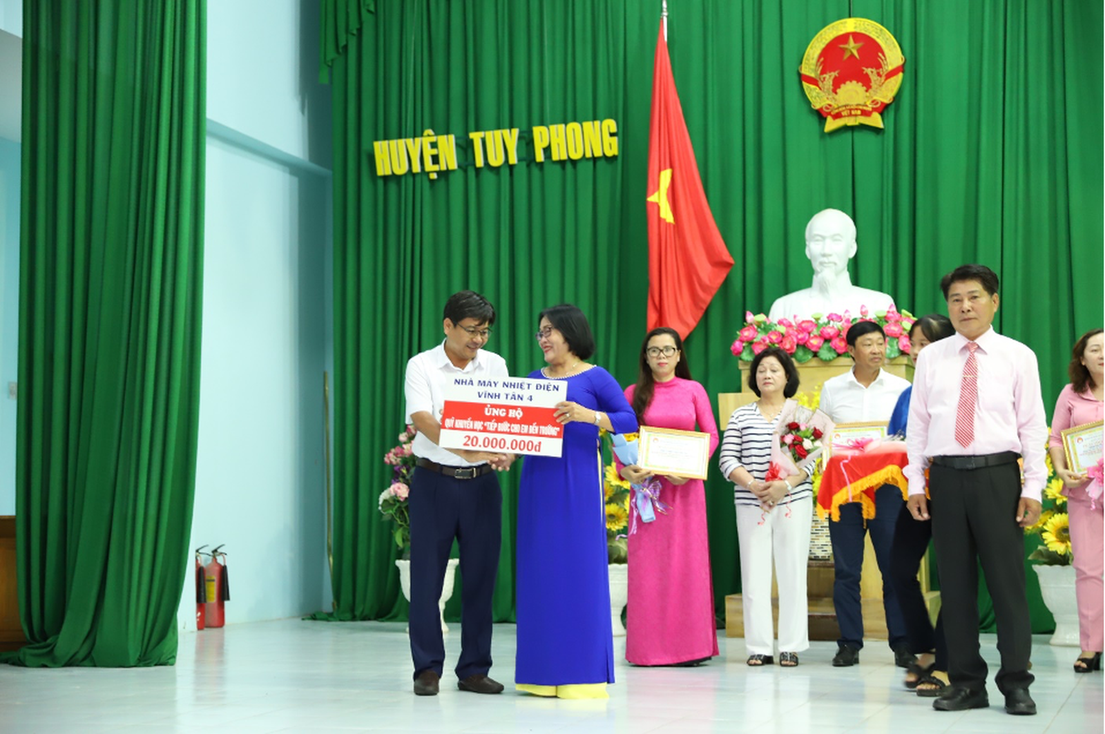 Đại diện lãnh đạo NMNĐ Vĩnh Tân 4 trao kinh phí ủng hộ Quỹ khuyến học "Tiếp bước cho em đến trường" huyện Tuy Phong