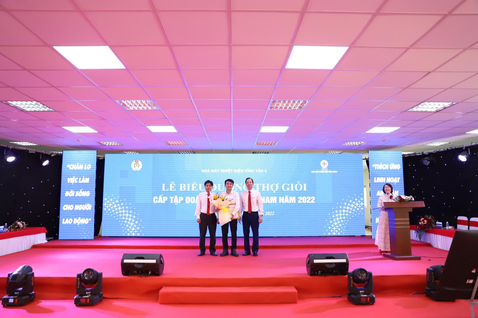 Giám đốc nhà máy và chủ tịch công đoàn tặng hoa Biểu dương đồng chí Trần Văn Linh - Tổ trưởng Tổ Trưởng ca NMNĐ Vĩnh Tân 4 đã xuất sắc đạt Giải nhất Hội thi thợ giỏi cấp EVN năm 2022 khối Nhiệt điện và được công nhận danh hiệu Trưởng ca giỏi cấp EVN năm 2022