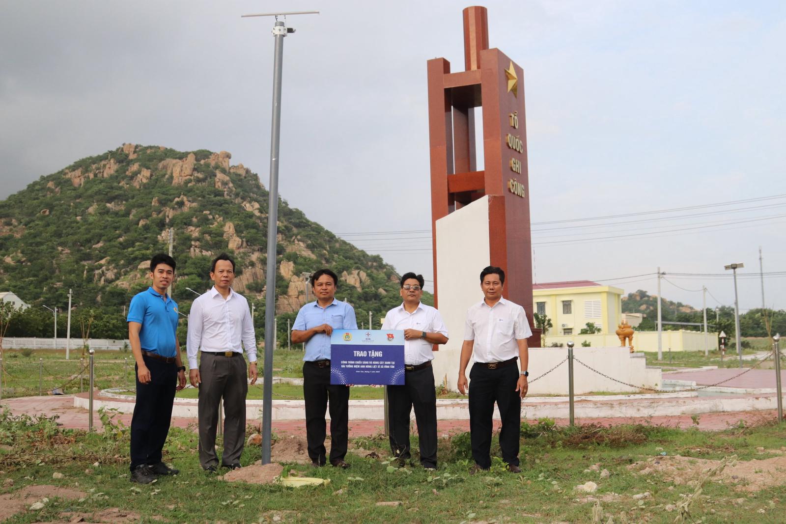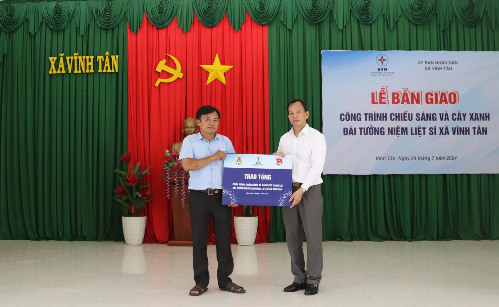 Ông Vũ Thanh Hải, Giám đốc Nhiệt điện Vĩnh Tân 4 trao tặng công trình chiếu sáng và cây xanh đài tưởng niệm liệt sỹ xã Vĩnh Tân, ảnh: BM