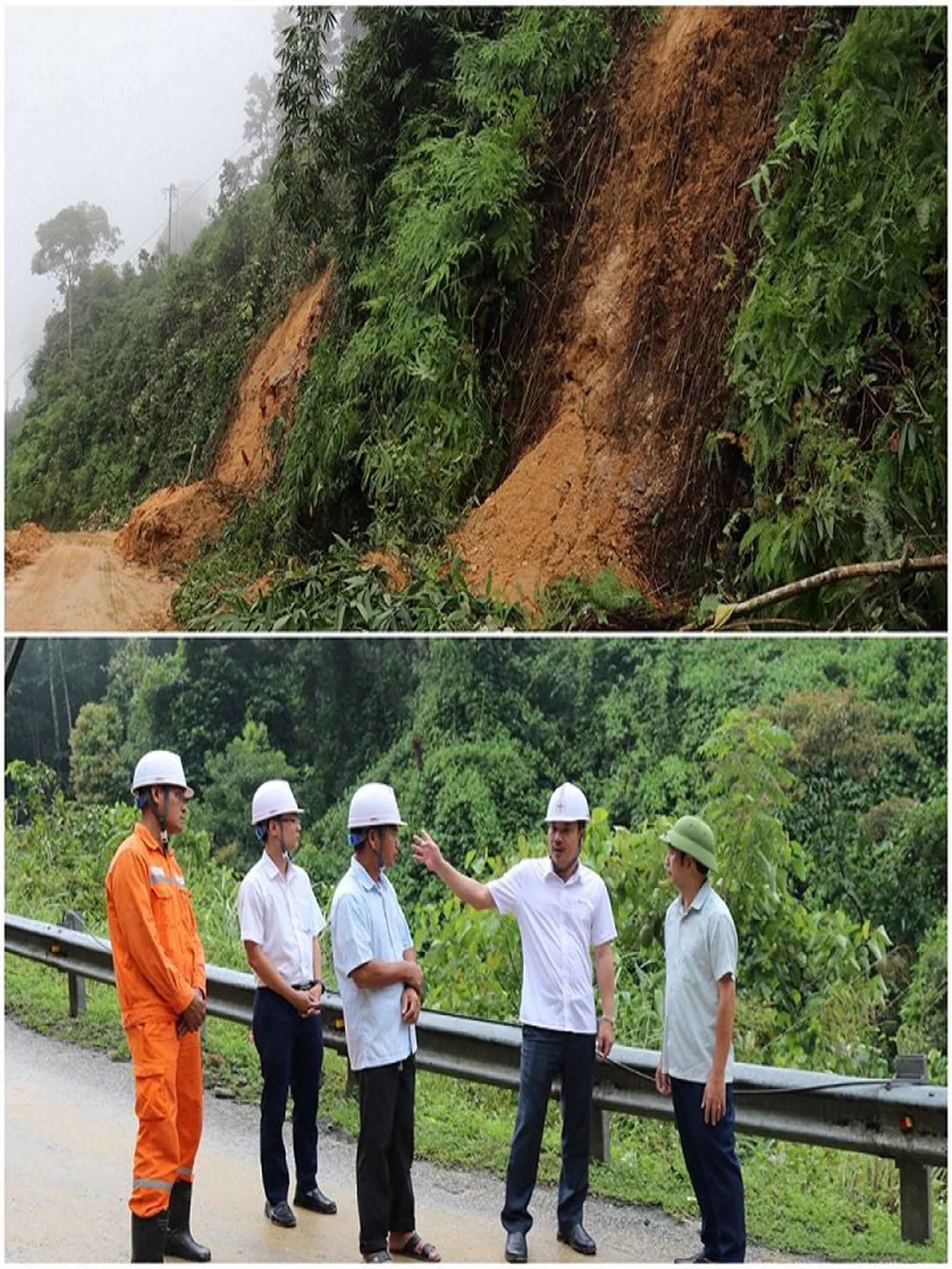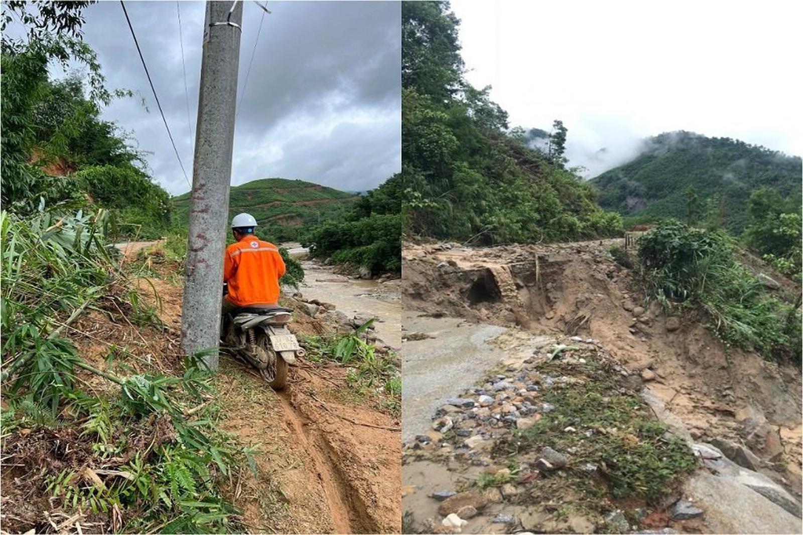 Mưa lũ gây sạt lở đường giao thông bị chia cắt, công nhân Điện lực rất khó khăn trong việc tiếp cận hiện trường xử lý sự cố. Ảnh: Nguyễn Thương