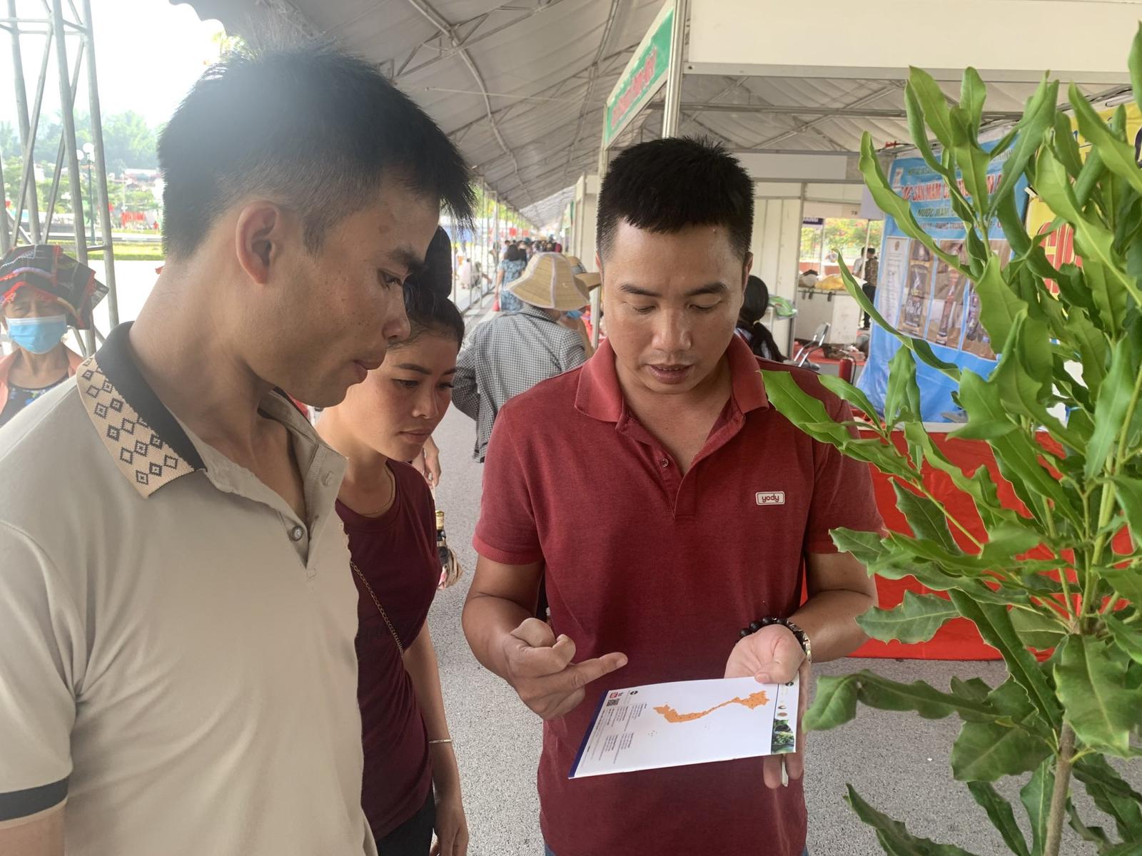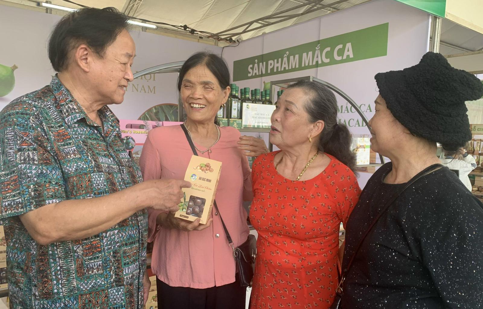 Ông Nguyễn Lân Hùng trực tiếp giới thiệu về cây trồng và sản phẩm mắc ca cho khách tham gia đến gian hàng của Hiệp hội mắc ca Việt Nam