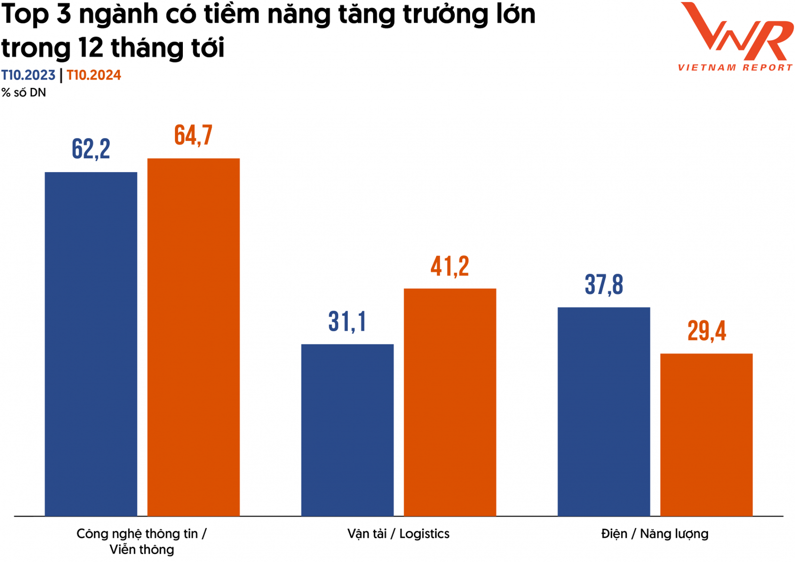 Kết quả khảo sát của Vietnam Report cũng chỉ ra top 3 ngành có tiềm năng tăng trưởng lớn nhất trong 12 tháng tới từ góc nhìn các doanh nghiệp VNR500. Thứ nhất là ngành công nghệ thông tin/ Viễn thông với tỷ lệ 64,7% doanh nghiệp bình chọn theo khảo sát của Vietnam Report. Thứ hai, ngành Vận tải/ Logistics, đây là mảnh ghép quan trọng của chuỗi cung ứng và gắn liền với hoạt động sản xuất kinh doanh. Bối cảnh kinh tế phục hồi sẽ là điều kiện quan trọng để Vận tải/ Logistics tăng trưởng, với tỷ lệ 41,2% doanh nghiệp bình chọn. Thứ ba, ngành Điện/ Năng lượng, đây là ngành đóng vai trò thiết yếu, cung cấp nguồn lực vận hành cho nền kinh tế. Với nhu cầu năng lượng tăng nhanh, ngành này được xếp ở vị trí tiềm năng tăng trưởng thứ ba trong 12 tháng tới.