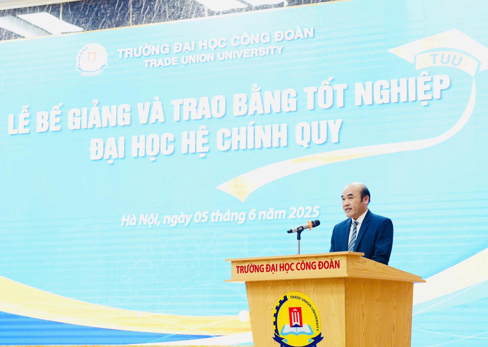 Phát biểu tại lễ bế giảng, PGS.TS Lê Mạnh Hùng, Hiệu trưởng Trường Đại học Công đoàn nhấn mạnh, kết quả đạt được ngày hôm nay của các tân cử nhân là minh chứng cho sự nỗ lực, cố gắng vượt qua nhiều thử thách, từng bước thích nghi với hoàn cảnh, vượt lên mọi trở ngại để cùng nhau hoàn thành xuất sắc nhiệm vụ dạy và học.