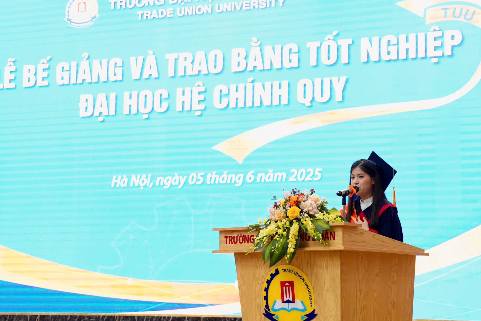 Đại diện cho các tân cử nhân tốt nghiệp năm 2025, em Ngô Quỳnh Trang, sinh viên xuất sắc toàn khóa, thủ khoa cấp trường, thủ khoa ngành kế toán xúc động nói: “Thay mặt cho các tân cử nhân, em xin được bày tỏ lòng biết ơn sâu sắc đến Ban Giám hiệu nhà trường đã luôn quan tâm, tạo điều kiện để người học có được môi trường tốt nhất trong quá trình học tập, rèn luyện tại trường.