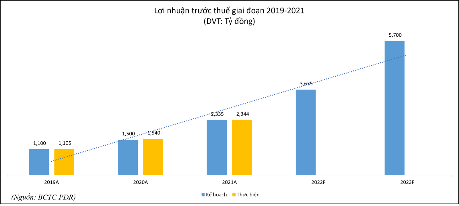 Trước đó, năm 2021, PDR cũng hoàn thành 100% kế hoạch lợi nhuận đã đề ra với lợi nhuận trước thuế đạt 2.344,4 tỷ đồng. Năm 2020, lợi nhuận trước thuế đạt 1.539 tỷ đồng và năm 2019 đạt 1,105 tỷ đồng.