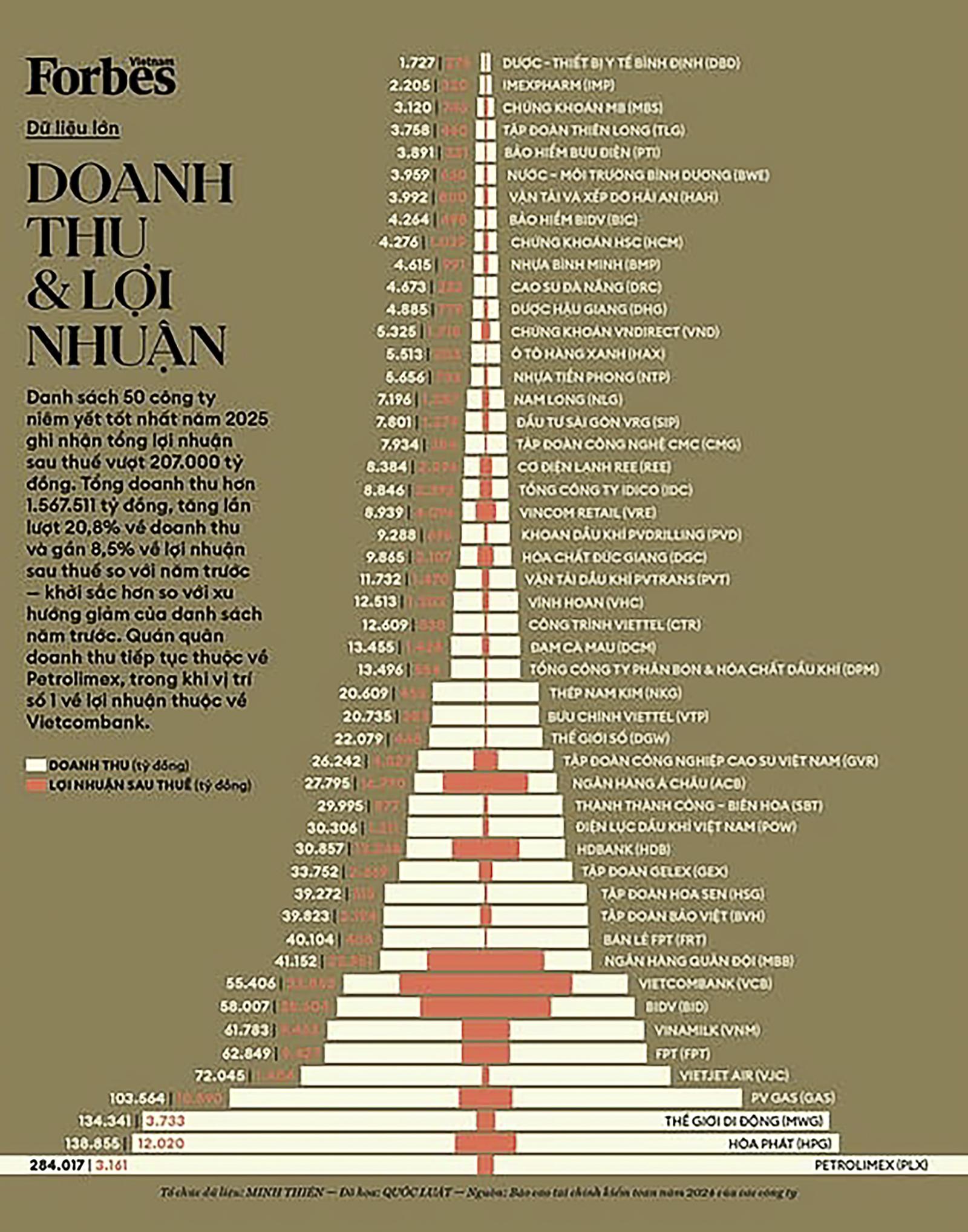Theo Forbes Việt Nam, tổng doanh thu của 50 công ty trong danh sách đạt hơn 1.567.511 tỷ đồng tăng 20,8% so với năm trước, trong khi tổng lợi nhuận sau thuế vượt 207.000 tỷ đồng tăng 8,5%.