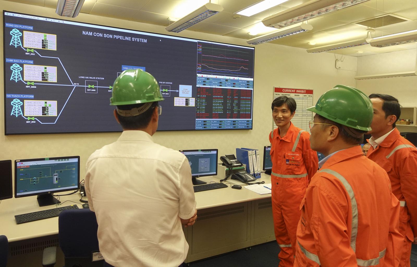 Lãnh đạo PV GAS làm việc với các kỹ sư PV GAS NCSP tại phòng điều khiển Nhà máy xử lý Khí Nam Côn Sơn