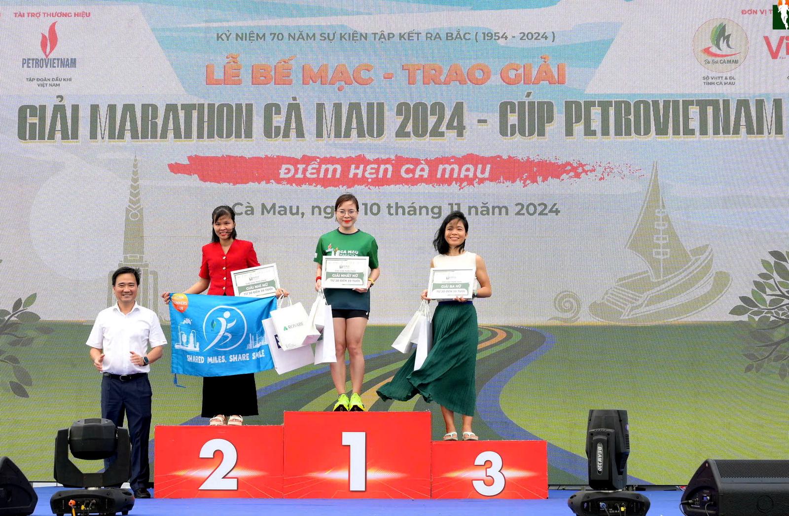 VĐV Đinh Thị Bích (Cơ quan điều hành PV GAS) nhận giải 3 cự ly 21km nữ lứa tuổi 30-39