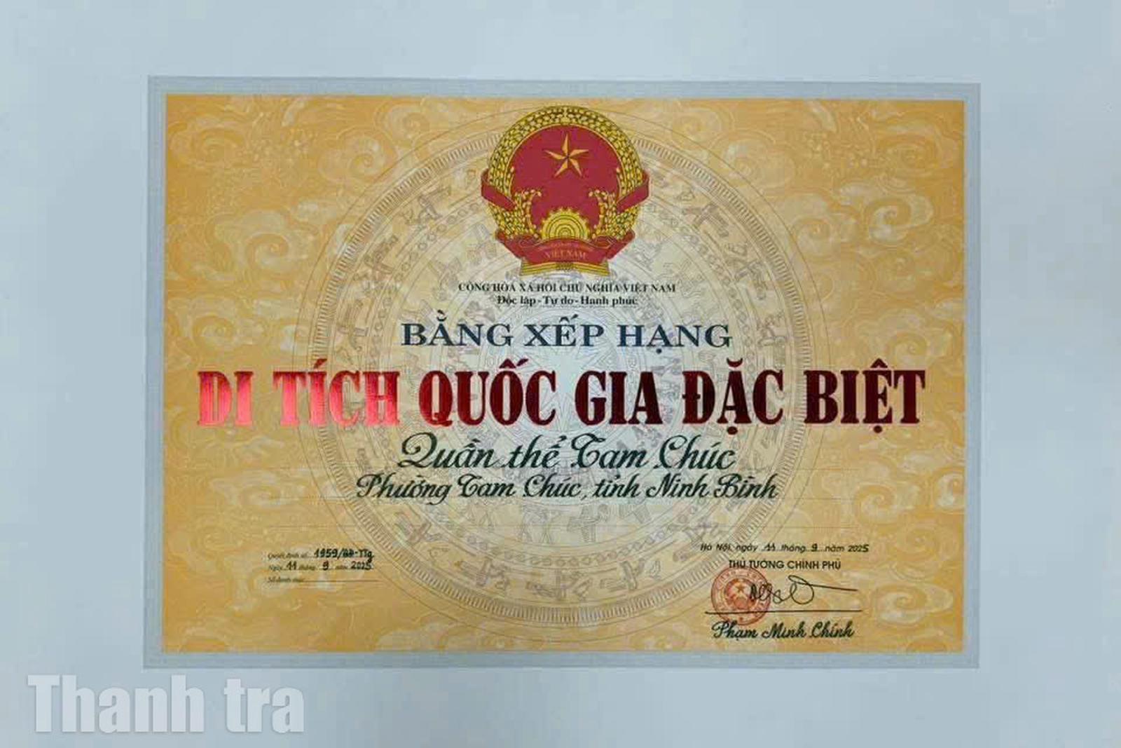 (Thanh tra) - Thủ tướng Chính phủ vừa ban hành Quyết định số 1959/QĐ-TTg chính thức xếp hạng Danh lam thắng cảnh và khảo cổ quần thể Tam Chúc là Di tích Quốc gia Đặc biệt.