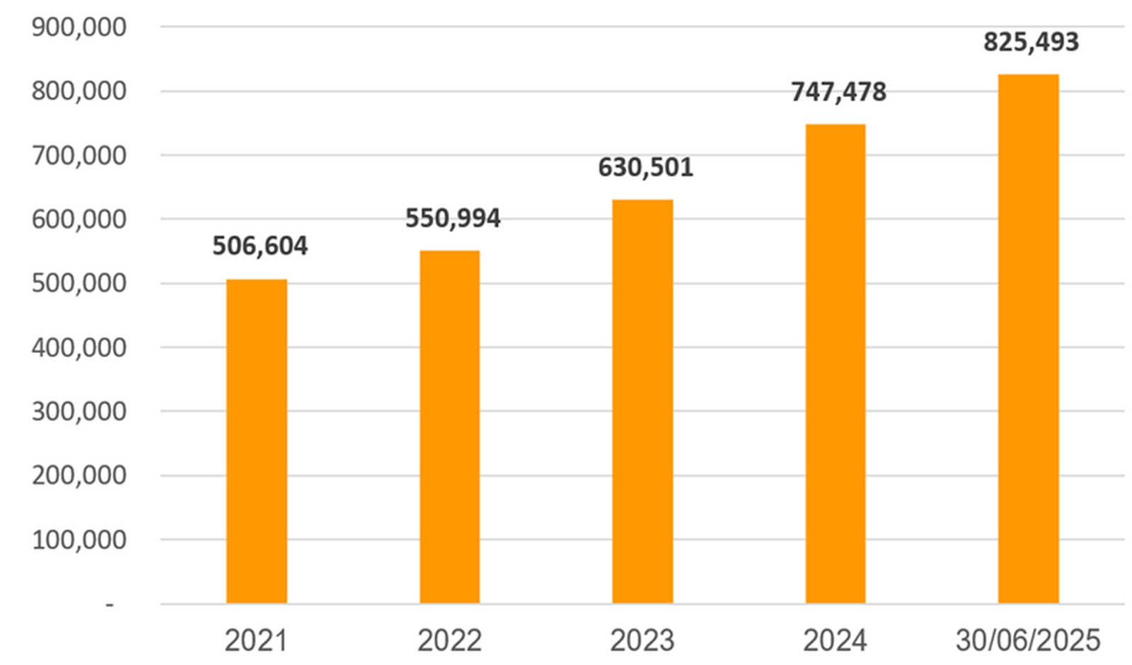 Tính đến 30/6/2025, tổng tài sản của SHB đạt gần 825 nghìn tỷ đồng, trong đó, dư nợ cho vay khách hàng vượt 594,5 nghìn tỷ đồng, tăng 14,4% so với đầu năm và tăng mạnh 28,9% so với cùng kỳ.