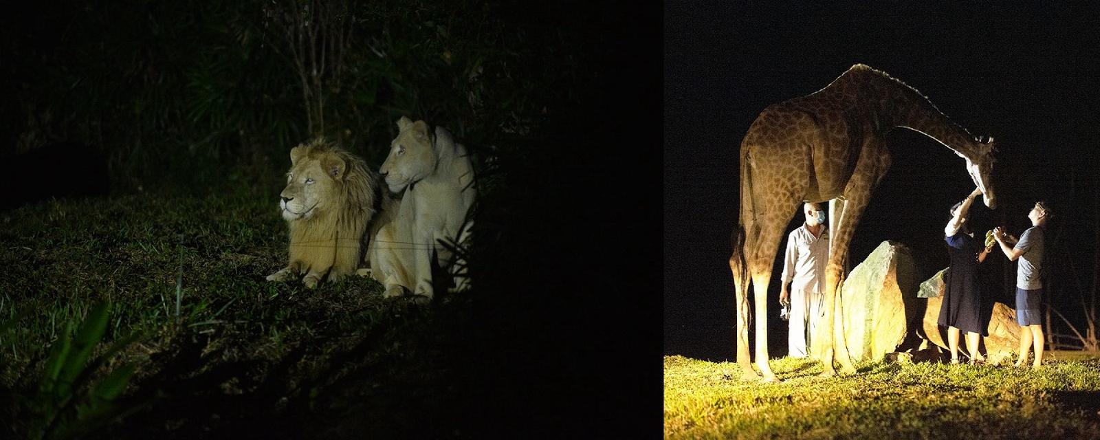 Buổi tối, Safari khoác lên mình diện mạo đầy kỳ bí dưới màn đêm u tịch. Trên chiếc xe charm “mở”, du khách sẽ một lần nữa “đột nhập” từ khu rừng nhiệt đới đến thảo nguyên savan hoang vu, hồi hộp quan sát những đàn hồng hạc, linh dương… quây quần trong “tổ ấm”; đàn hổ, sư tử lẩn khuất sau khu chuồng trại kiên cố… Đặc biệt, dù là Night Safari nhưng những vị khách đặc biệt của tour này vẫn có cơ hội tương tác với các cô nàng hươu cao cổ tò mò, tranh thủ vòi đồ ăn vặt, chạm đến những chú ngựa vằn béo tròn… giữa những âm điệu du dương, kỳ diệu của “bản giao hưởng hoang dã”.