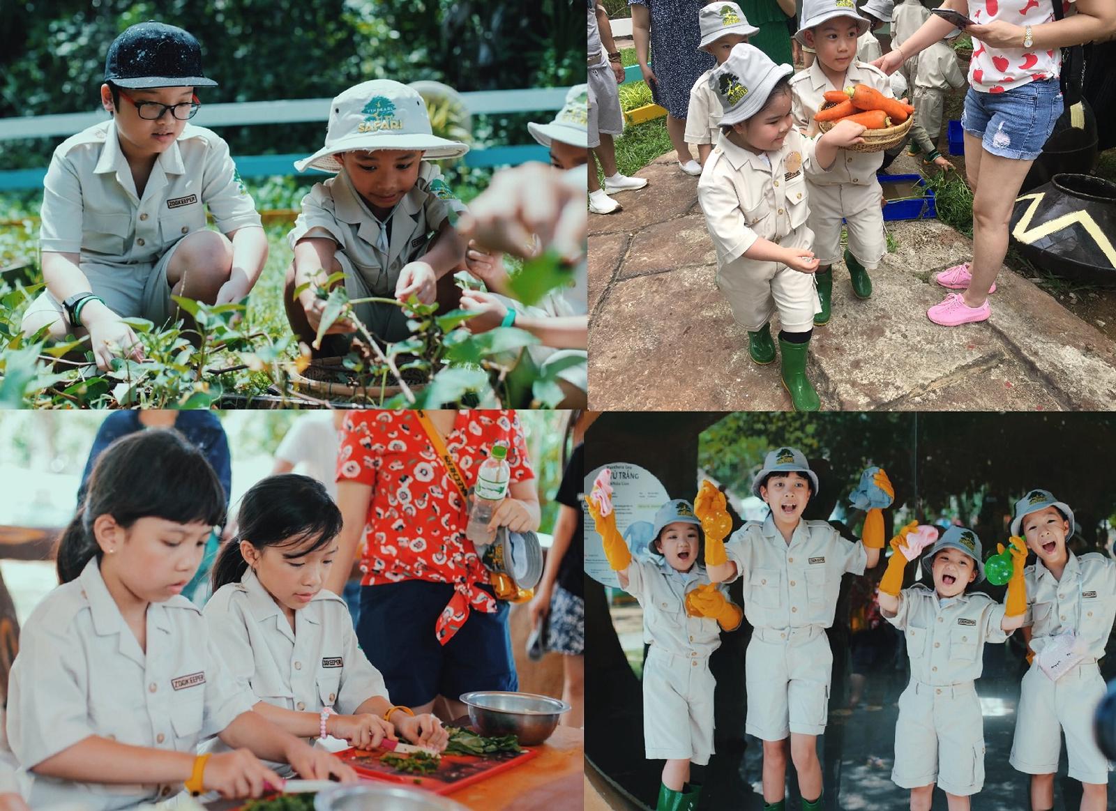 Khoác lên mình đồng phục Vinpearl Safari, những “bảo mẫu nhí” háo hức thu hoạch rau củ, cẩn thận chế biến và tận tay mang cho các bạn dê, cừu, chồn đất... tại khu Kid’s Zoo ăn xế.