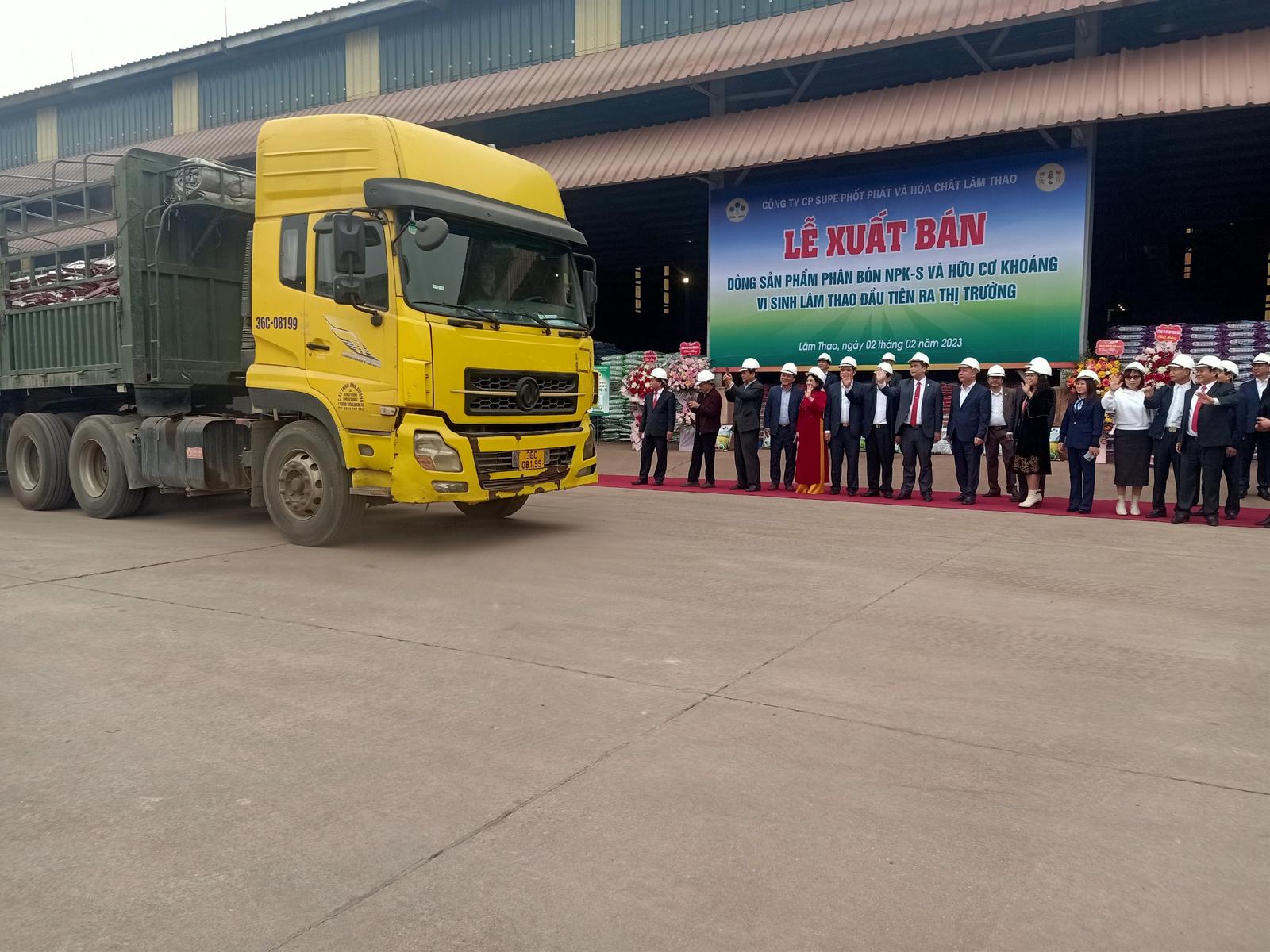 Dòng sản phẩm phân bón NPK-S vi sinh Lâm Thao và hữu cơ khoáng vi sinh Lâm Thao đầu tiên đang được lăn bánh xuất bán ra thị trường. Ảnh: CB