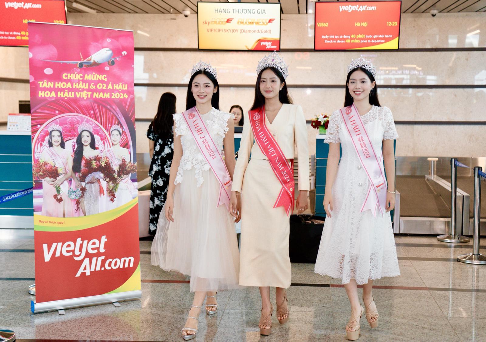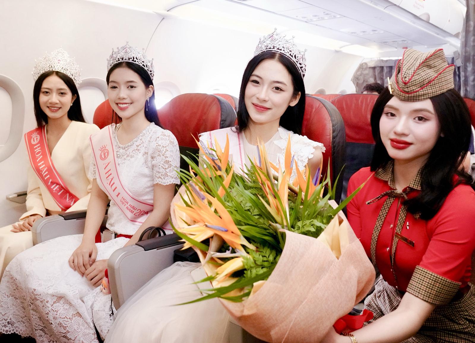 Tân Hoa hậu Việt Nam 2024 Hà Trúc Linh cùng hai Á hậu rạng rỡ trên chuyến bay đầu tiên sau đăng quang