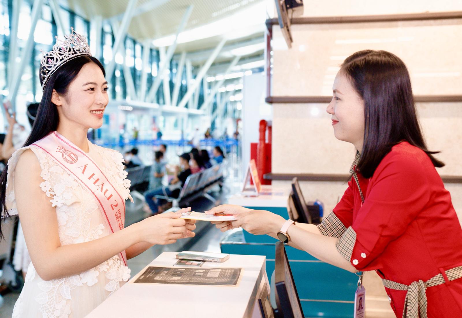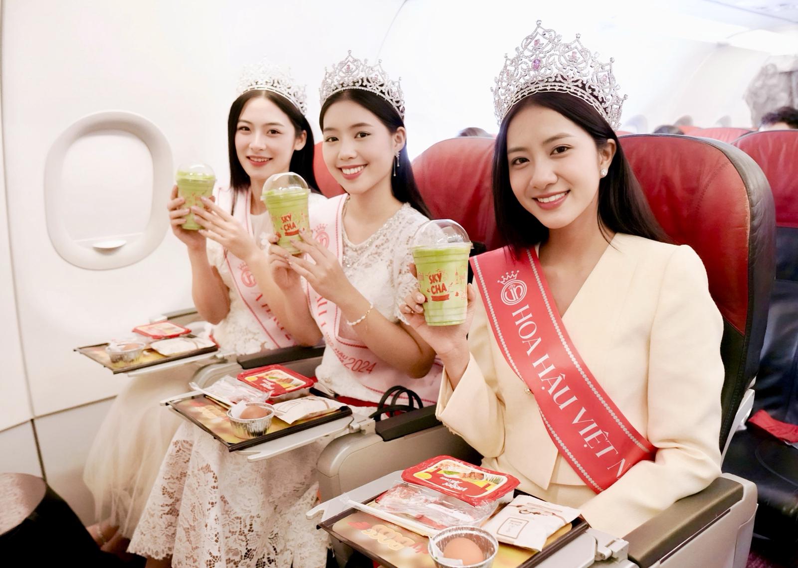 Từ mặt đất đến bầu trời, Tân Hoa hậu và hai Á hậu Việt Nam 2024 săn sóc tận tình với dịch vụ SkyBoss đẳng cấp của phi hành đoàn Vietjet.