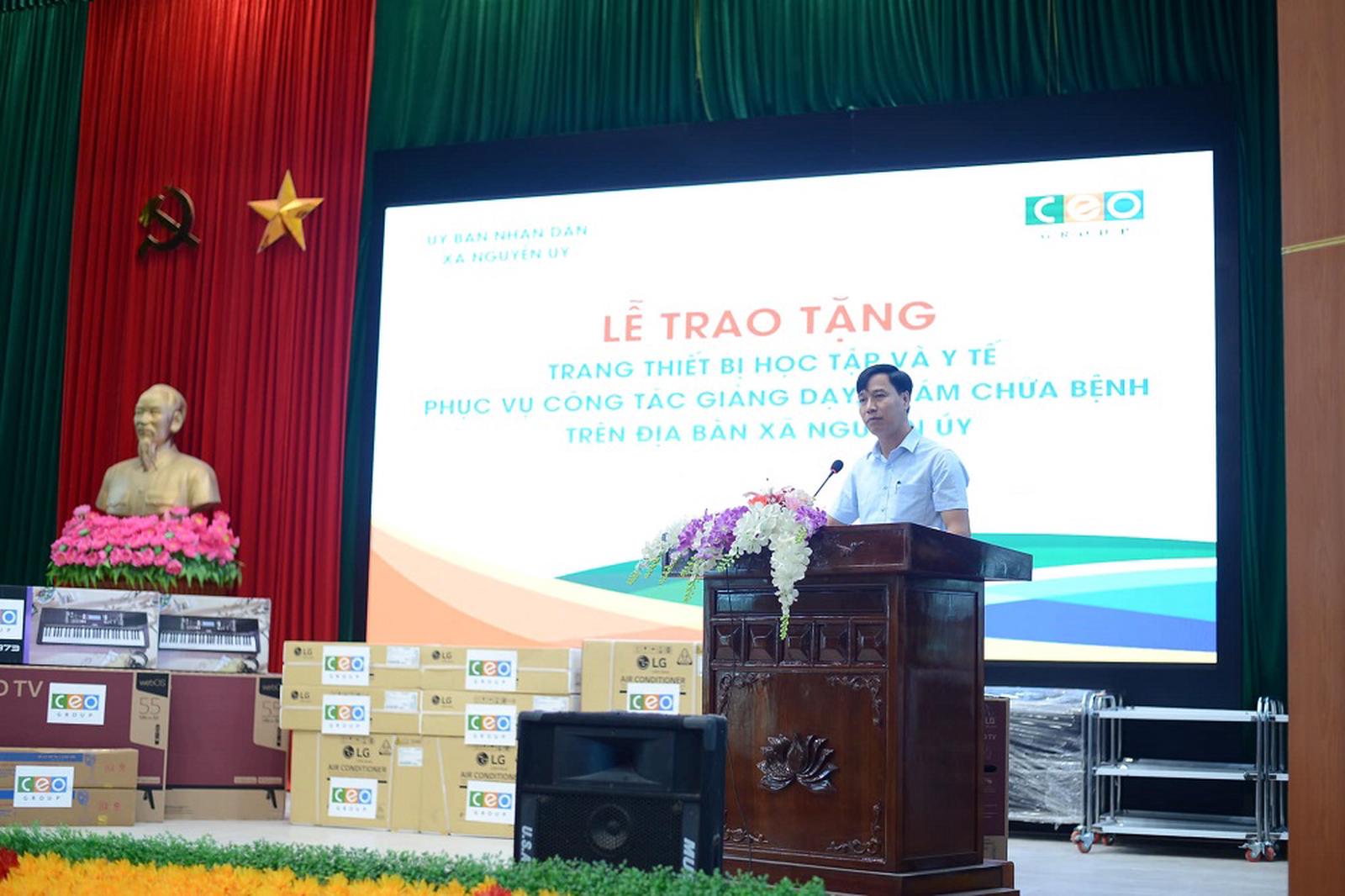 Chia sẻ tại sự kiện, ông Đoàn Văn Minh - Tổng Giám đốc Tập đoàn CEO cho biết, với hoạt động trao tặng các trang thiết bị giáo dục, y tế, Tập đoàn mong muốn có thể góp phần nâng cao chất lượng cơ sở vật chất ngành Giáo dục - Đào tạo và ngành Y tế tại địa phương, qua đó nâng cao chất lượng đời sống người dân. Bên cạnh đó, tại Tập đoàn CEO, nhiều thành viên trong Ban Lãnh đạo Tập đoàn và CBNV là những người con sinh ra và lớn lên tại xã Nguyễn Úy nói riêng cũng như tỉnh Hà Nam nói chung, do đó, hoạt động lần này còn mang ý nghĩa “uống nước nhớ nguồn”, thể hiện lòng tri ân và biết ơn của những người con xa quê với quê hương, nguồn cội.