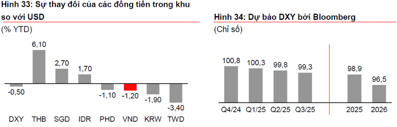 Lộ trình cắt giảm lãi suất của FED theo đó sẽ trở nên khó dự báo hơn. Tuy từ nay đến cuối năm, khả năng cao FED vẫn giữ nguyên lộ trình cắt giảm 50 điểm cơ bản theo kịch bản cơ sở (25 điểm vào cuộc họp tháng 11 và 25 điểm vào cuộc họp tháng 12), nhưng dài hạn thì sẽ khó dự báo hơn do FED cần thêm thời gian để đánh giá tác động của việc cắt giảm thuế và kế hoạch chi tiêu của ông Trump lên lạm phát. Theo đó, tỷ giá USD VND được kỳ vọng sẽ giữ ổn định cho đến cuối năm 2024, tuy nhiên sẽ đối mặt với nhiều biến động khó lường trong năm 2025 do ảnh hưởng từ các chính sách của ông Trump sau khi ông nhậm chức vào tháng 1 năm 2025.