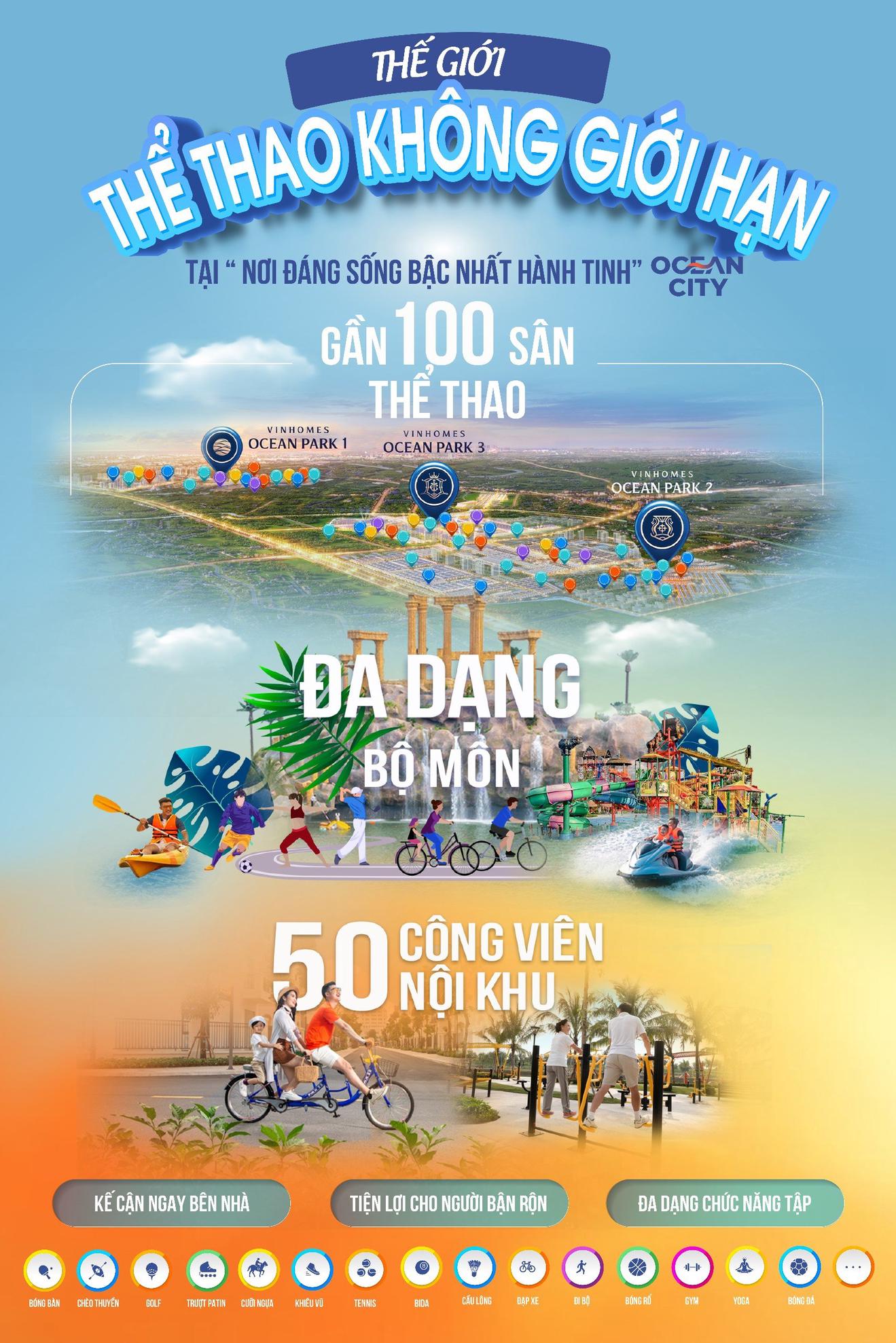 Tạo nên sức hấp dẫn cho “đô thị đáng sống bậc nhất hành tinh” không chỉ có ưu thế vượt trội của cảnh quan, môi trường, sự hiện diện của hệ sinh thái tiện ích, dịch vụ chất lượng quốc tế mà còn là bộ sưu tập các tiện ích thể thao quy mô và đẳng cấp, bật tung chất sống trẻ trung, năng động, thời thượng, giúp cư dân phát triển toàn diện Thân - Tâm - Trí mỗi ngày.