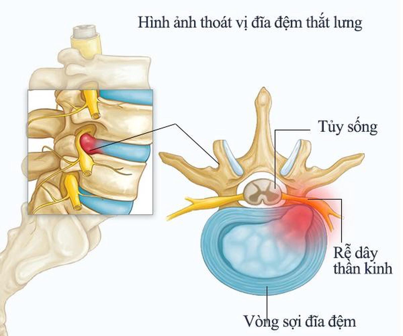 Thoát vị đĩa đệm là tình trạng nhân nhầy tràn ra ngoài chèn ép vào rễ dây thần kinh. Ảnh minh họa: Thu Hương