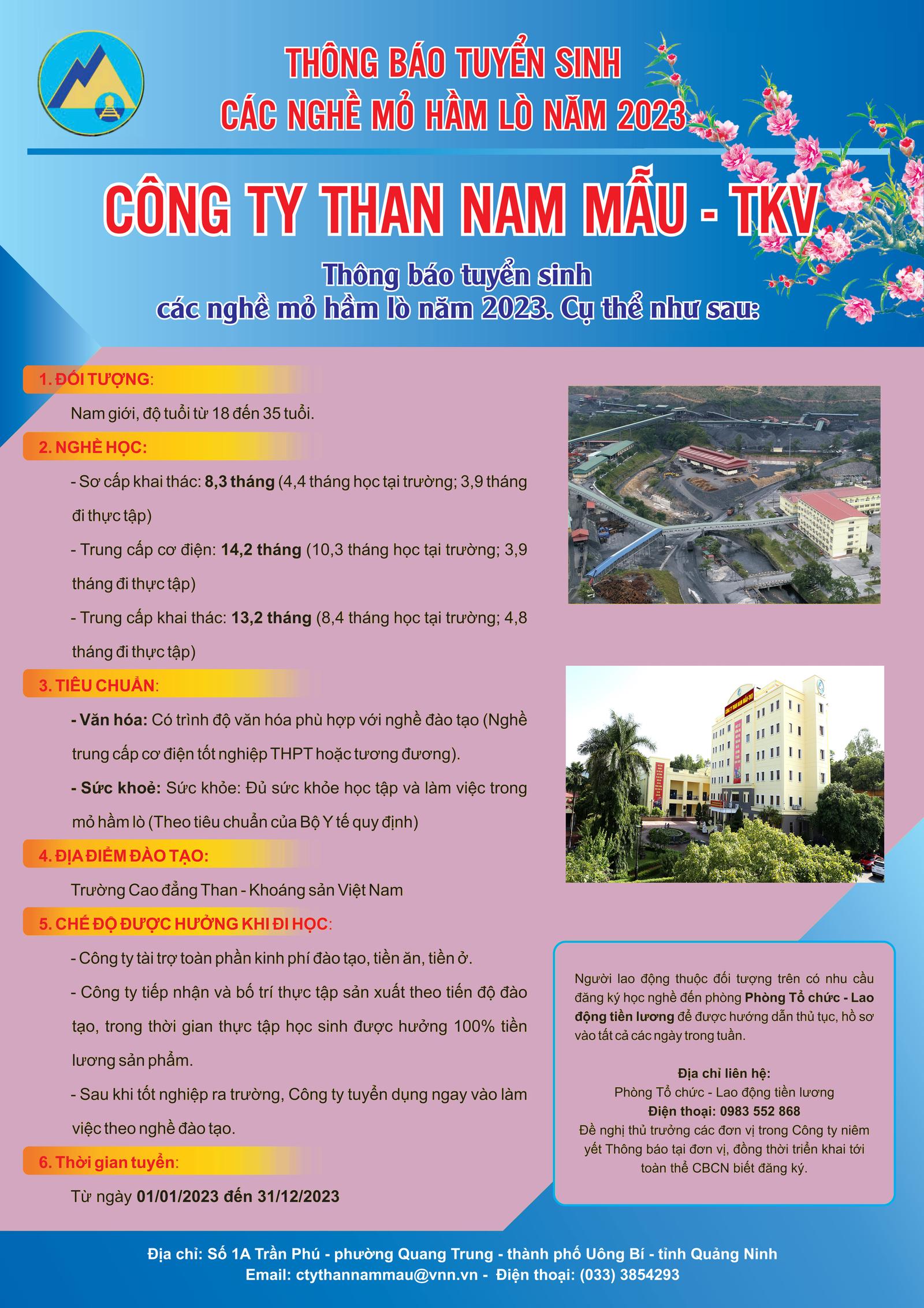 Công ty Than Nam Mẫu - TKV xin thông báo tuyển sinh các nghề mỏ hầm lò năm 2023, cụ thể như sau: