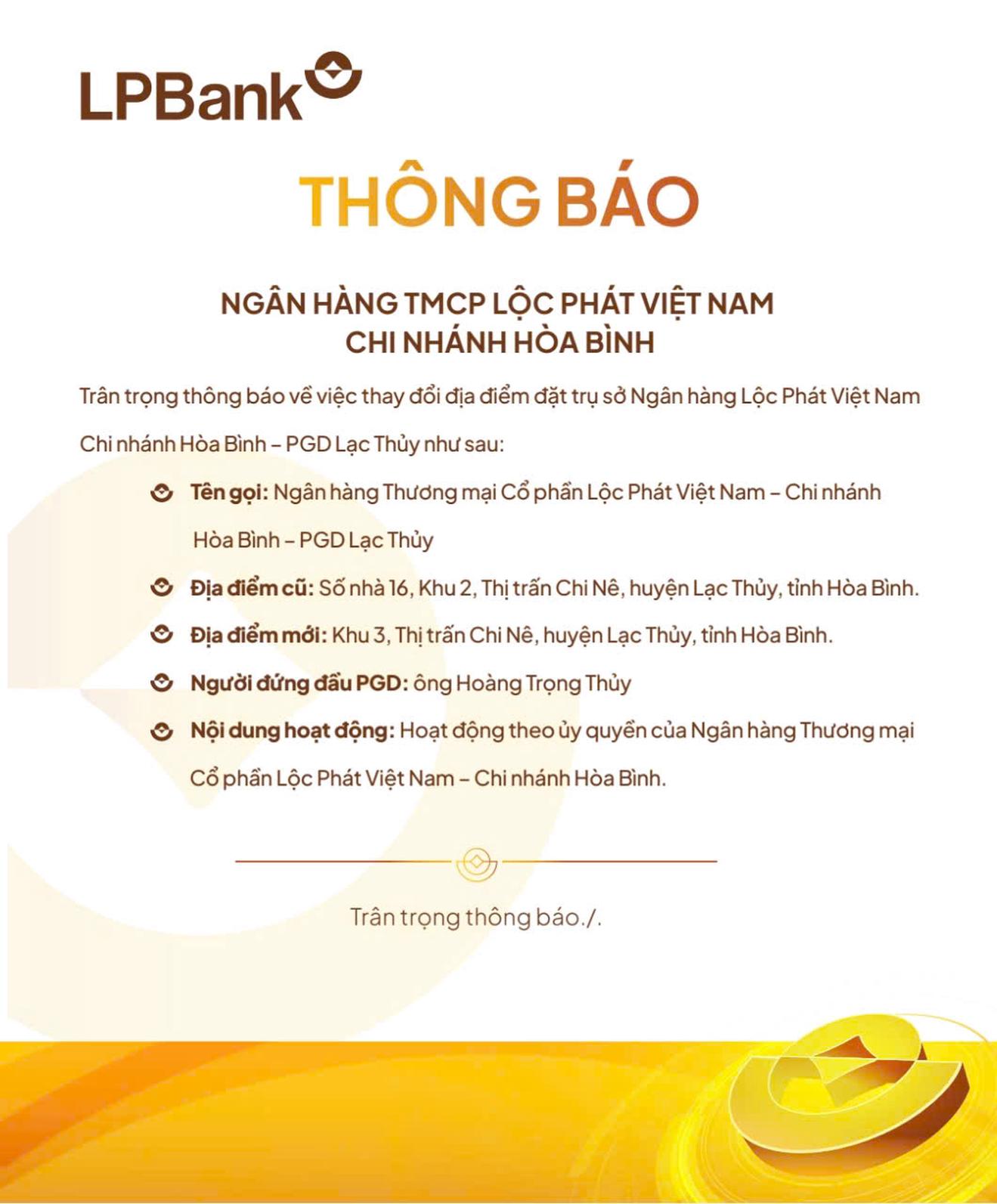 Ngân hàng TMCP Lộc Phát Việt Nam Chi nhánh Hòa Bình trân trọng thông báo về việc thay đổi địa điểm đặt trụ sở Ngân hàng Lộc Phát Việt Nam - Chi nhánh Hòa Bình- PGD Lạc Thủy như sau:
