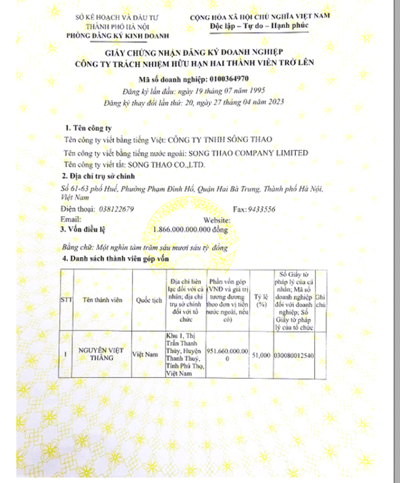 - Công ty TNHH Sông Thao, Mã số doanh nghiệp: 0100364970 đăng ký lần đầu ngày 19 tháng 07 năm 1995; Đăng ký thay đổi lần thứ 20 ngày 27 tháng 04 năm 2023.