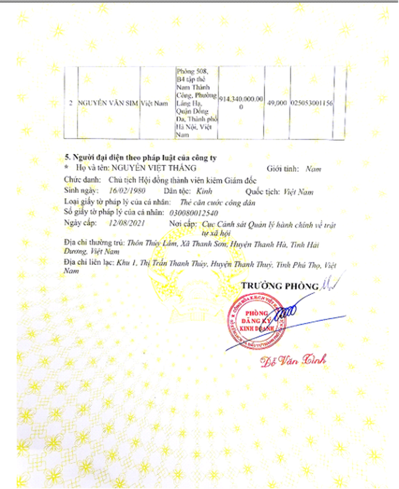 + Ông Nguyễn Văn Sim, số vốn góp là 914.340.000.000 đồng, chiếm 49% vốn điều lệ công ty, địa chỉ liên lạc: Phòng 221, Khách sạn Thanh Thuỷ, Khu 1, thị trấn Thanh Thuỷ, huyện Thanh Thuỷ, tỉnh Phú Thọ.