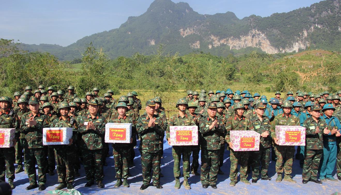 Các đồng chí lãnh đạo Quân khu, lãnh đạo Tỉnh tặng quà động viên các lực lượng tham gia diễn tập