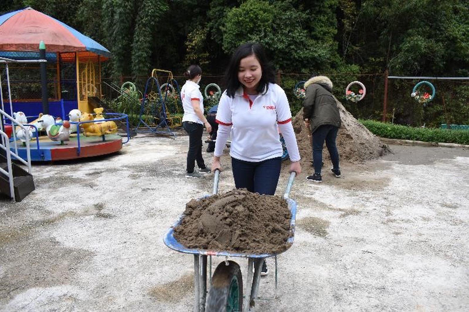 Nhân viên công ty TNS Holdings tham gia công tác tu sửa trường học tại xã Mẫu Sơn