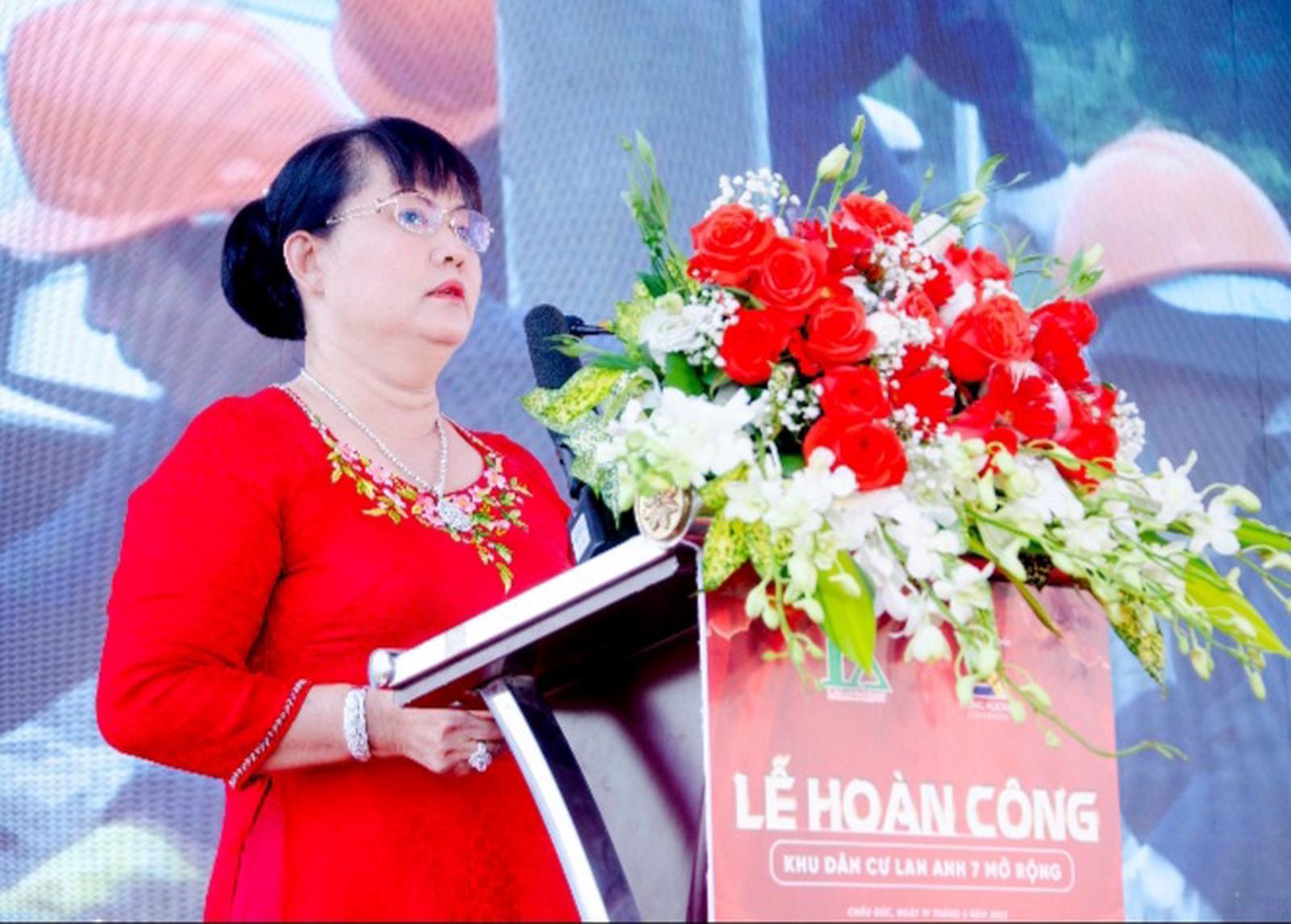 Bà Nguyễn Nam Phương, Chủ tịch Hội đồng thành viên Công ty TNHH Lan Anh phát biểu tại lễ hoàn công