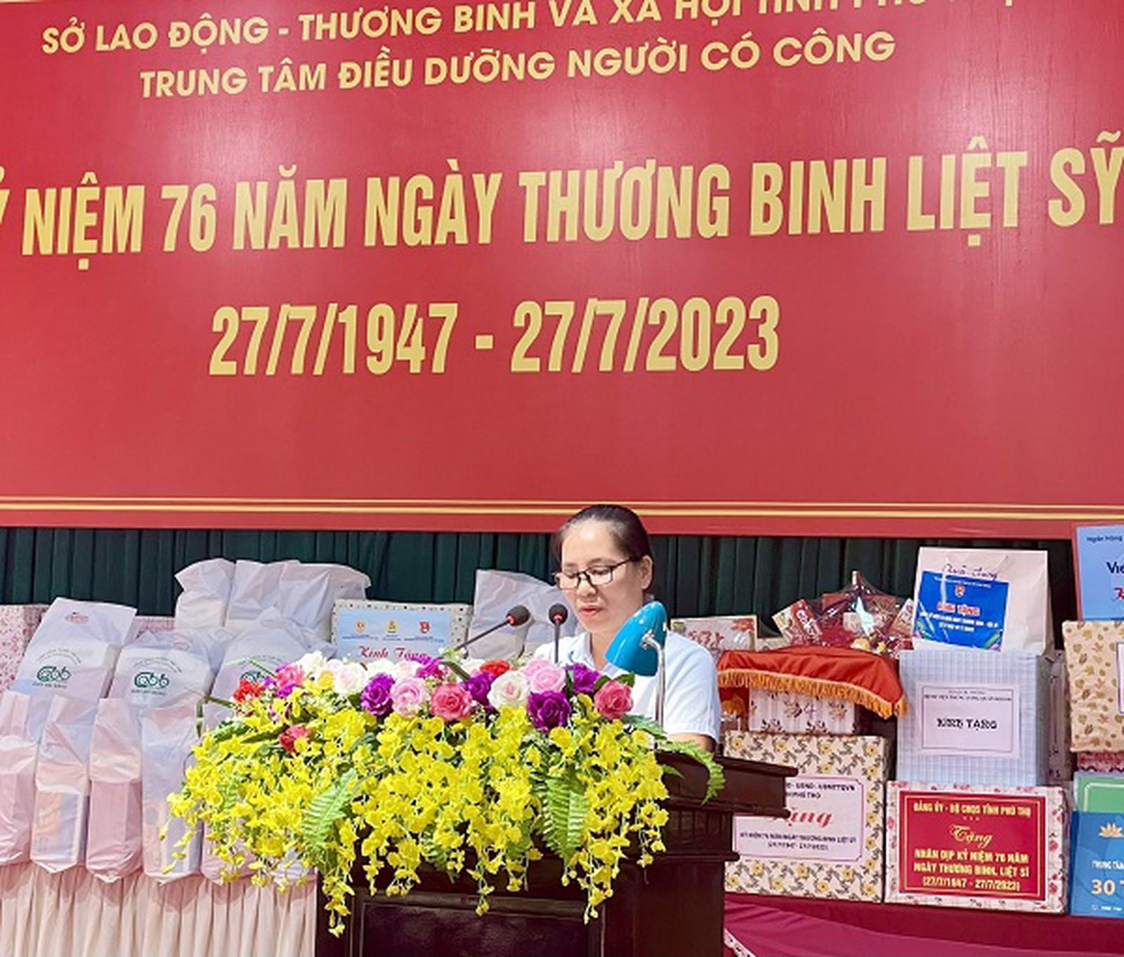Đồng chí Nguyễn Thị Việt Hà – Phó Phòng Tổ chức Cán bộ Tổng công ty phát biểu tri ân các thương, bệnh binh đã hy sinh xương máu trong công cuộc bảo vệ Tổ Quốc