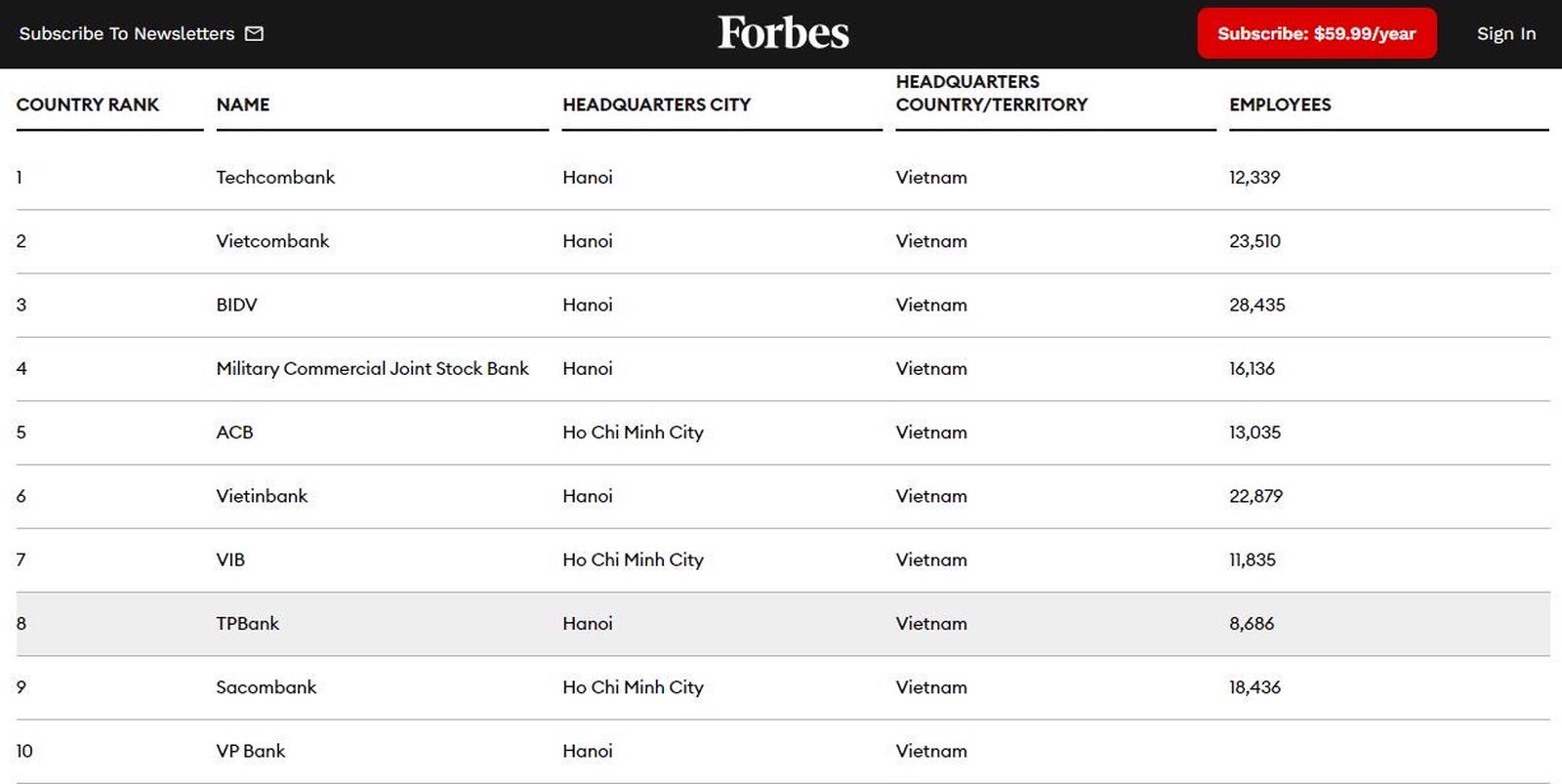 Vượt lên trên nhiều ngân hàng có quy mô lớn, TPBank xếp vị trí thứ 8 trong bảng xếp hạng các ngân hàng tốt nhất của Forbes. Kết quả được ghi nhận thông qua việc khảo sát hơn 49.000 cá nhân trên 33 quốc gia bằng 17 ngôn ngữ khác nhau. Những người tham gia được yêu cầu đánh giá mức độ hài lòng chung của họ với từng ngân hàng cũng như liệu họ có muốn giới thiệu ngân hàng đó cho người khác hay không, dựa trên năm tiêu chí: độ tin cậy, các điều khoản và điều kiện (phí và lãi suất), dịch vụ khách hàng (thời gian chờ đợi và sự hữu ích của nhân viên), dịch vụ kỹ thuật số (dễ sử dụng trang web và ứng dụng) và chất lượng tư vấn tài chính.