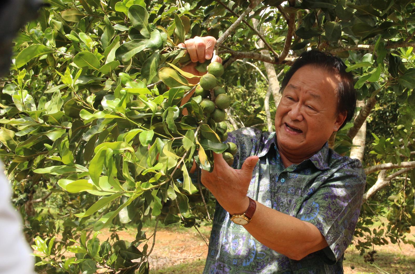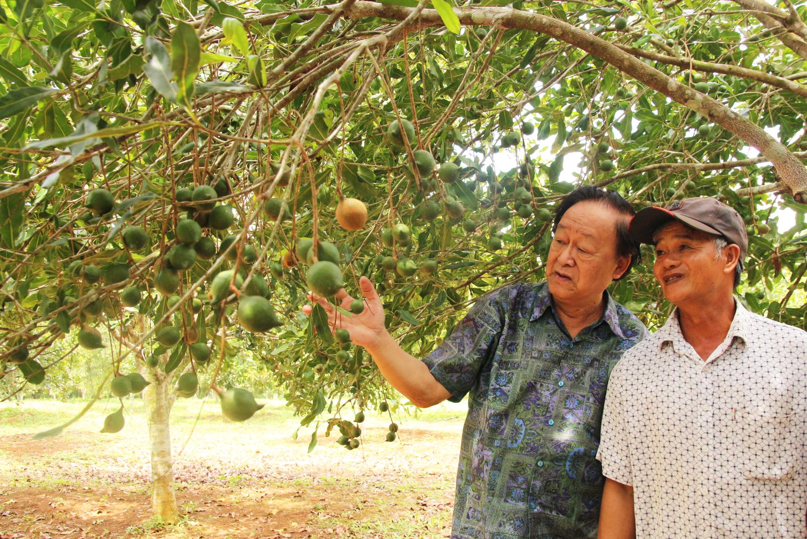 PGS.TS Nguyễn Lân Hùng ngỡ ngàng cây mắc ca trồng xã Vĩnh Sơn, (H.Vĩnh Thạnh, Bình Định) hợp khí hậu, phát triển tốt, ra quả sai