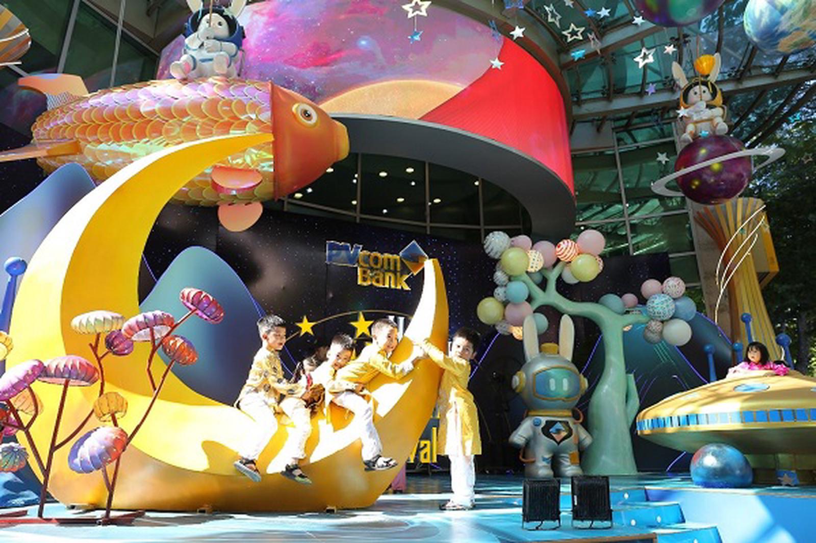 Ngay từ đầu tháng 8 âm lịch, PVcomBank đã trang trí tiểu cảnh trung thu với ý tưởng về dải ngân hà rực rỡ, có bầu trời, mặt trăng, trái đất và những vì tinh tú.