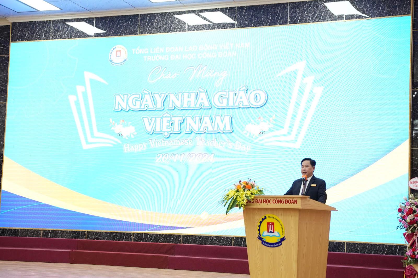 Phát biểu tại lễ kỷ niệm, Phó Giáo sư, Tiến sĩ Lê Mạnh Hùng, Phó Bí thư Phụ trách Đảng ủy, Hiệu trưởng Trường Đại học Công đoàn nêu đã gửi lời chúc mừng và tri ân sâu sắc tới các thế hệ lãnh đạo, các thầy giáo, cô giáo, viên chức, người lao động nhà trường, những người đã và đang cống hiến hết mình cho sự nghiệp trồng người dưới mái trường Đại học Công đoàn thân yêu.