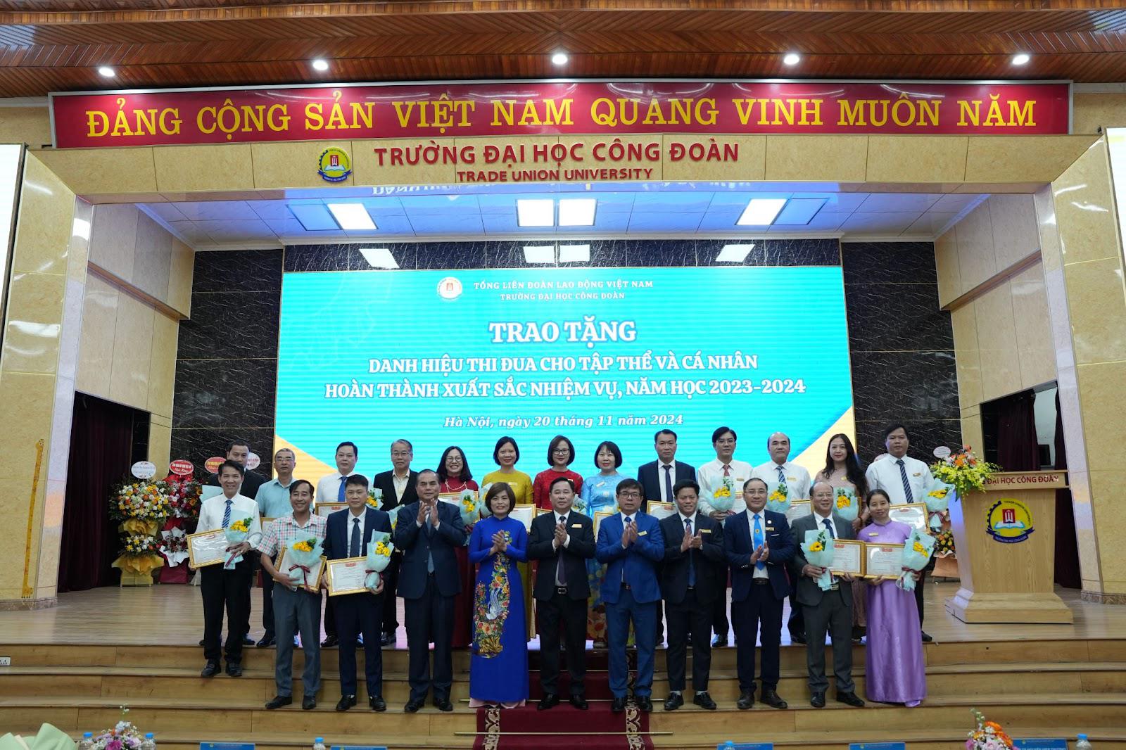 Phó Giáo sư, Tiến sĩ Lê Mạnh Hùng và Thạc sĩ Nguyễn Xuân Hoà trao danh hiệu Tập thể lao động xuất sắc và tặng hoa cho các đơn vị có thành tích xuất sắc trong thực hiện nhiệm vụ năm học 2023-2024.