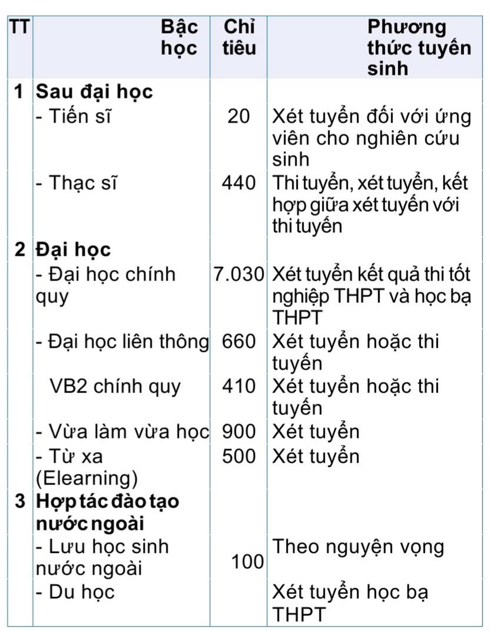 Đối với hệ đại học từ xa, đối tượng tuyển sinh là học sinh phổ thông; cán bộ, công chức, người đang làm việc tại các cơ quan, tổ chức, doanh nghiệp, lực lượng vũ trang,... đã có bằng tốt nghiệp THPT, bổ túc văn hóa trở lên; những người đã có bằng tốt nghiệp trung học chuyên nghiệp, trung cấp, trung cấp nghề, cao đẳng, cao đẳng nghề, đại học. Phương thức tuyển sinh là xét tuyển.
