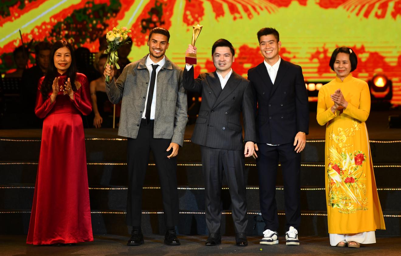 Phó Chủ tịch T&T Group Đỗ Vinh Quang cùng hai cầu thủ Đỗ Duy Mạnh, Đỗ Hoàng Hên nhận giải Khát vọng cống hiến tối 15/4.