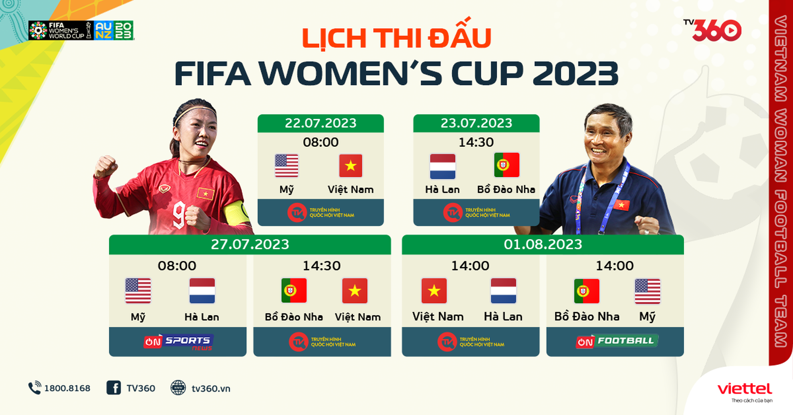 Cùng cổ vũ cho các cô gái Vàng của Đội tuyển Quốc gia Việt Nam trong trận đầu ra quân: Việt Nam và Mỹ, 8h00 ngày 22/7/2023 tại http://s.viettel.vn/tv360worldcup